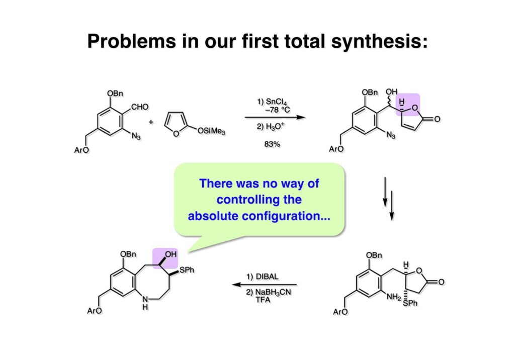最初の全合成ではフラン体 (1-2) のアルデヒド (1-1) への不斉付加が考えられなかったのでラセミ体合成になった。現在知られている不斉ルイス酸触媒を使えば不斉合成ができる可能性は高いかもしれない。