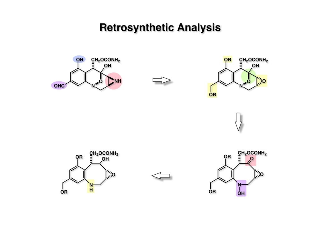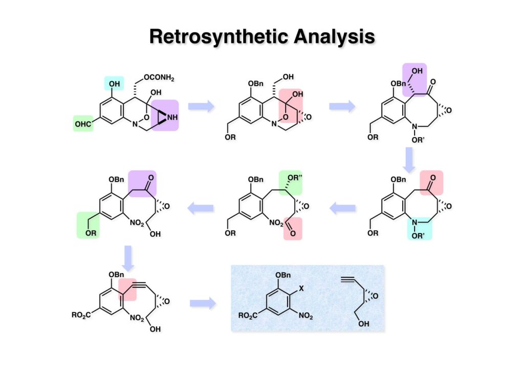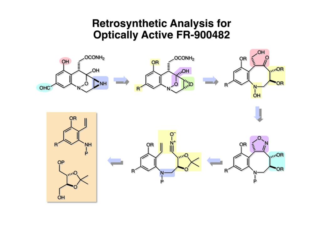 FR-900482の構造はマイトマイシンC (MMC)の構造と共通点が多いため、逆合成解析はMMCの全合成中に蓄積した知見を元にして行った。まず、(1-1) のフェノールとアルデヒドを保護し、アジリジンの構築はエポキサイドから行うことにして (1-2) に導いた。(1-2) のブリッジを開環すると (2-2) となるが、ヒドロキシルアミンはアミンを酸化して合成することにし、渡環反応をブロックするためにケトンはアルコールにしておくとすると (2-1) が中間体の候補となる。