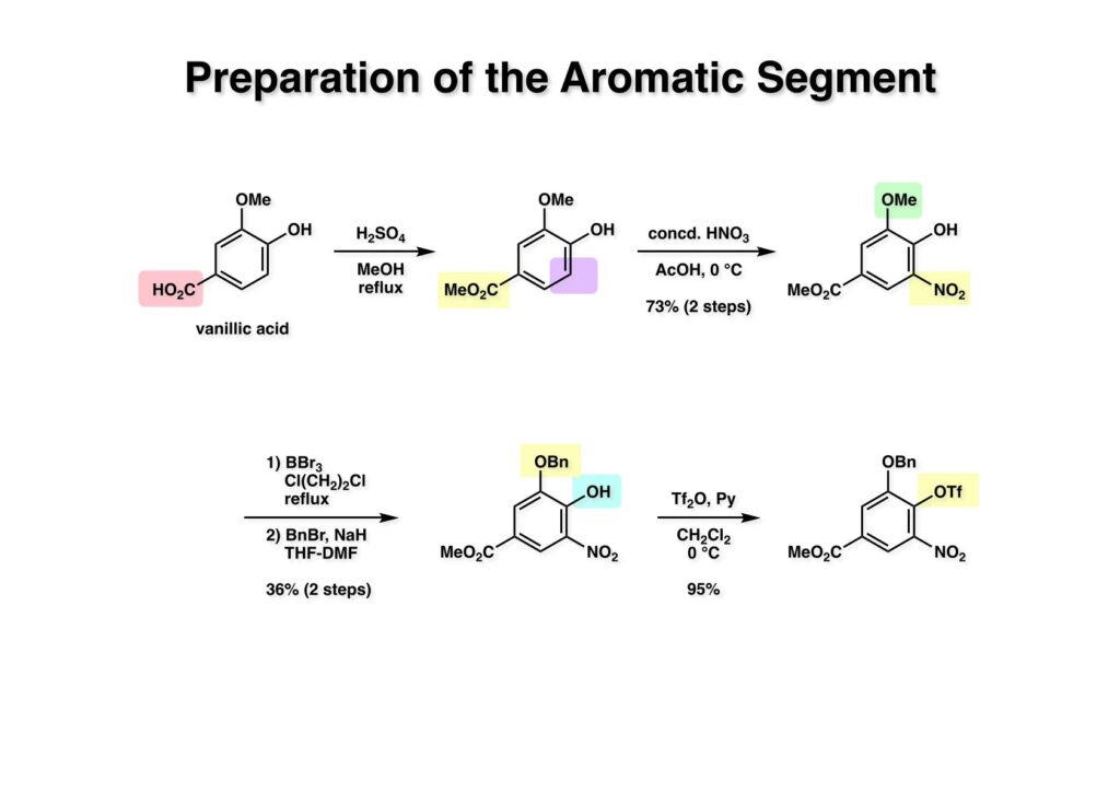 芳香環部分の合成は見たとおりで、市販のバニリン酸をエステル化し、ニトロ化すると (1-3) が得られる。OH基のオルト、パラ配向性とCO2Me基のメタ配向性を合わせるとニトロ化の位置は自ずと決まる。次の脱メチル化はBCl3では役不足で、特にオルト位にOH基があると無理なので、より強力なBBr3を使わなければならない。続くベンジル化は酸性度から言えばNO2のオルト位のフェノールの方がアニオンになりやすいので、NaHで強制的にジアニオンにし、立体的に空いていて反応性の高いアニオンの方をベンジル化して (2-1) を得た。残るフェノールは常法によりトリフレート (2-2) にした。