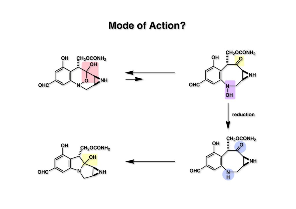 ヘミアミナール (1-1) は容易に脱水して、アジリジノマイトセン体 (1-2) を形成し、この活性種がDNAのdouble strandをアルキル化して細胞増殖を阻害すると考えられる。