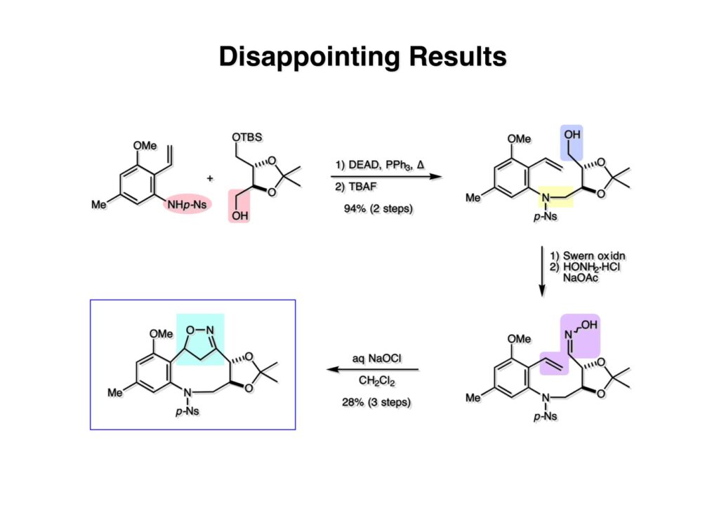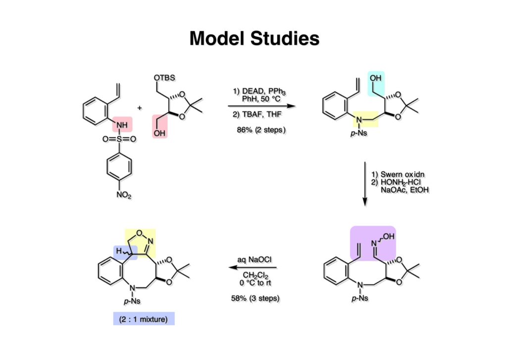 ノシル基の開発は別項の「反応開発」で解説するつもりだが、まだ全合成の項の解説に手いっぱいでそこまで手が回らない。ここでは初期に行ったモデル実験について記述するが、簡単に合成できるノシル体 (1-1) と酒石酸から誘導したアルコール体 (1-2) を光延反応でカップリングさせ、生成物のTBS基をTBAFで除去して (1-3) を得た。次に、水酸基の Swern酸化で生じたアルデヒドを常法でオキシム (2-2) に変換した。このオキシムを次亜塩素酸ソーダで酸化して生じたニトリルオキシドは、首尾よく1,3-双極子付加反応が進行して付加体 (2-1) を2:1のジアステレオマー混合物 (2-1) を58%の収率で与えた。ここでは立体化学を特定していない。なお、p -ノシル体では58%、o -ノシル体では30%の収率だったため、通常はアミンの活性化に優先的に用いないp -ノシル体を使うことにした。