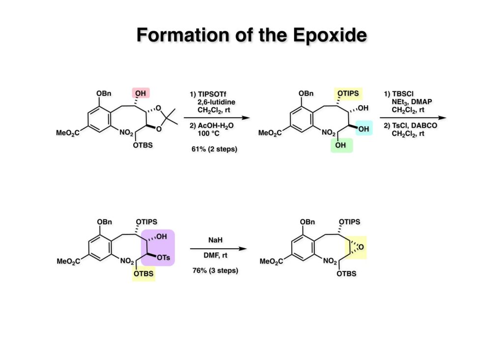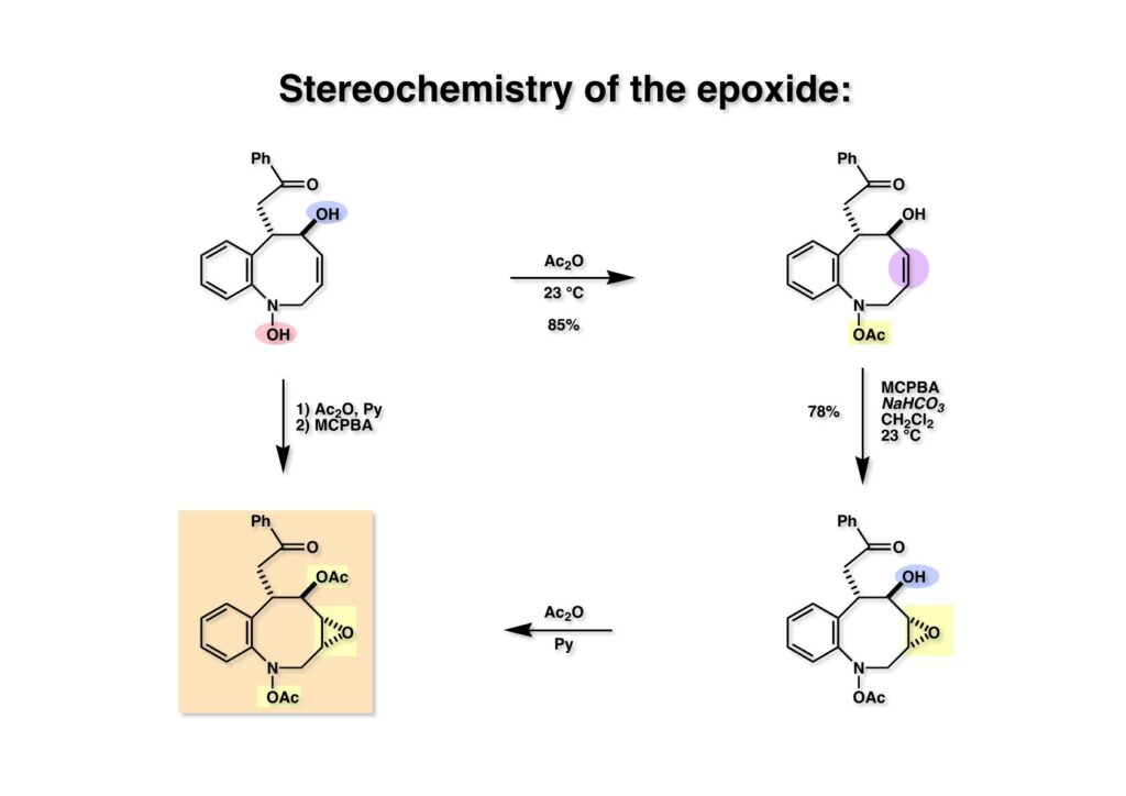 そこで、8員環のうちに二重結合をエポキサイドに変換することを試みた。まず、(1-1) のヒドロキシルアミンをアセチル化で保護し、得られたアセテート (1-2) をMCPBAで酸化したところ望むエポキサイド (2-2) が得られた。環状アリルアルコールの過酸によるエポキシ化にはHenberst則が知られている。つまり水酸基と同じ側から優先してエポキシ化が起きるというルールであるが、8員環アリルアルコールにはこのルールは適用できない。(2-2) の水酸基をアセテートで保護して (2-1) が得られた。