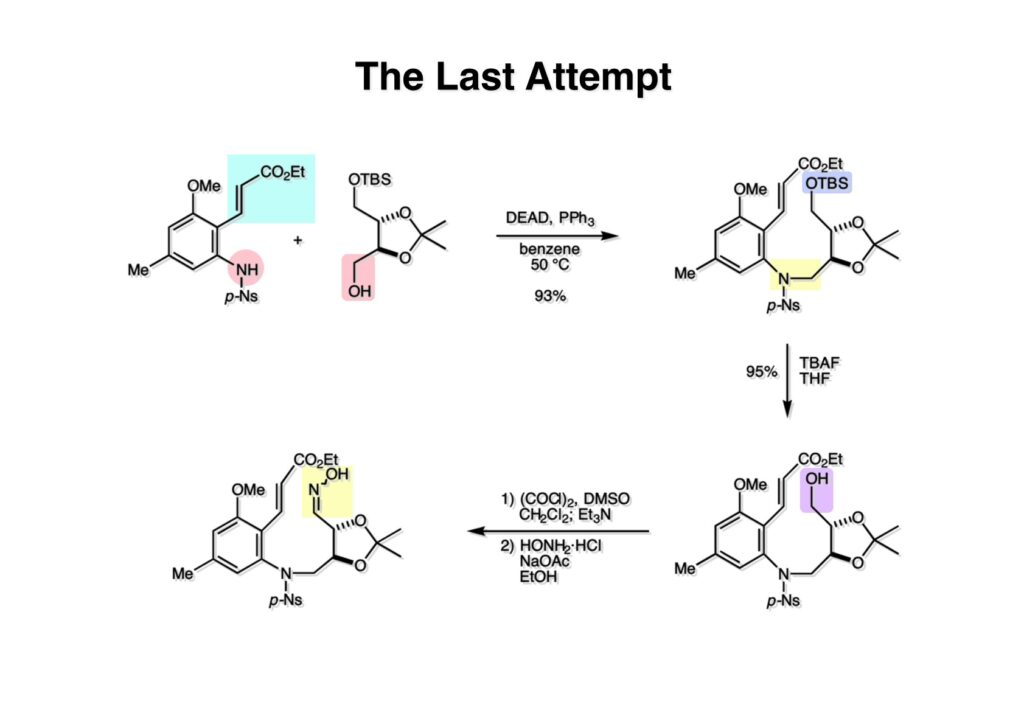 ライス大学でMMC合成をヒントにしたFR-900482の全合成を完成させたが、8員環構造をもっと違う方法で構築したいと思っていたので、東大着任後にモデル実験を開始した。今回の試みはFR-900482そのものの合成には至らなかったが、そういうアプローチもあるものだという事を示せたと思う。
