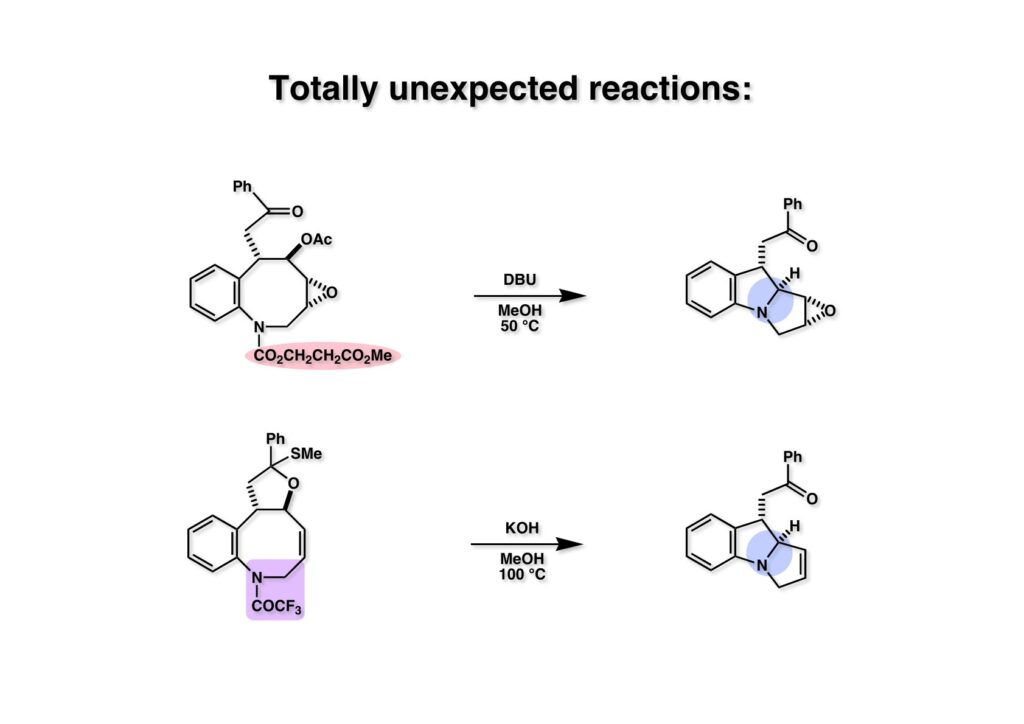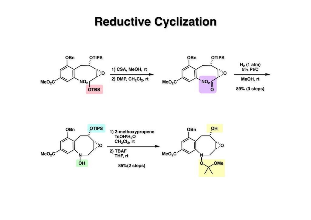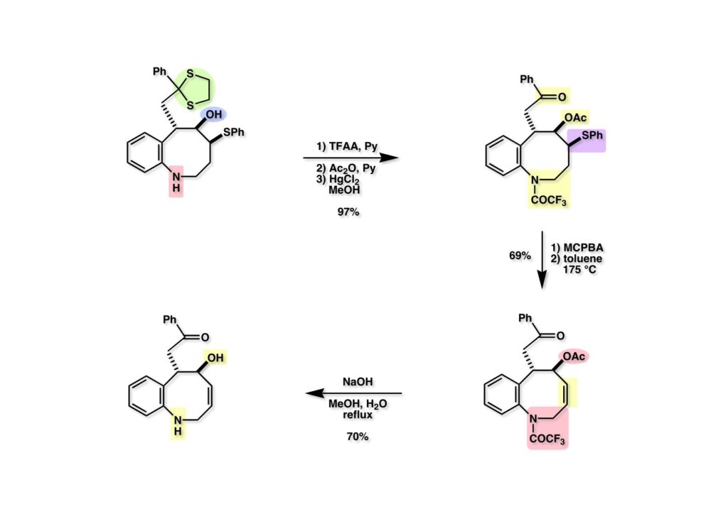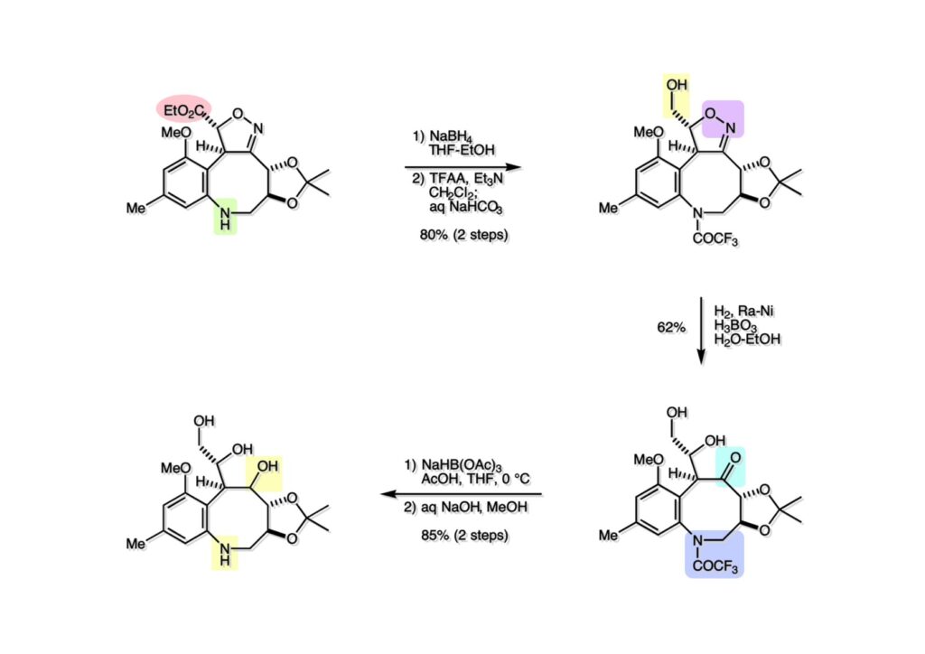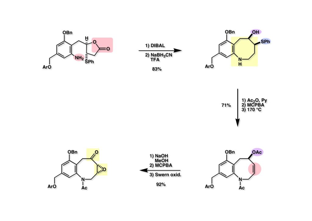 (1-1) のラクトンをDIBAL還元し、次にNaBH3CNとTFAで還元すると還元的アミノ化が進行して8員環アミン (1-2) が得られた。カルコン付加体由来の化合物では還元的アミノ化が進行しなかったので、やはりベンジル位の置換基とオルト位の置換基との立体反発に起因すると考えられる。(1-2) の水酸基とアミンをアセチル化し、スルホキシド脱離を行うとオレフィン体 (2-2) が得られた。更に (2-2) のアセテートを加メタノール分解した後にMCPBAで二重結合をα面からエポキシ化し、水酸基をSwern酸化すると (2-1) が高収率で得られた。