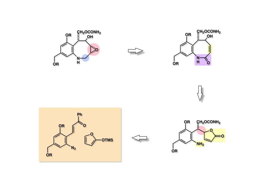 (1-1) のエポキサイドは (1-2) のα,β-不飽和ラクタムへの過酸化水素類のMichael付加を実現させれば良い。ここで (1-2) の水酸基とカルボニル基を巻き直すと (2-3) のようなブテノライドとなる。(2-3) はMMC全合成の初期実験に用いた反応を参考にして、カルコン (2-1) とフラン体 (2-2) のMichael反応で構築できることが予見される。