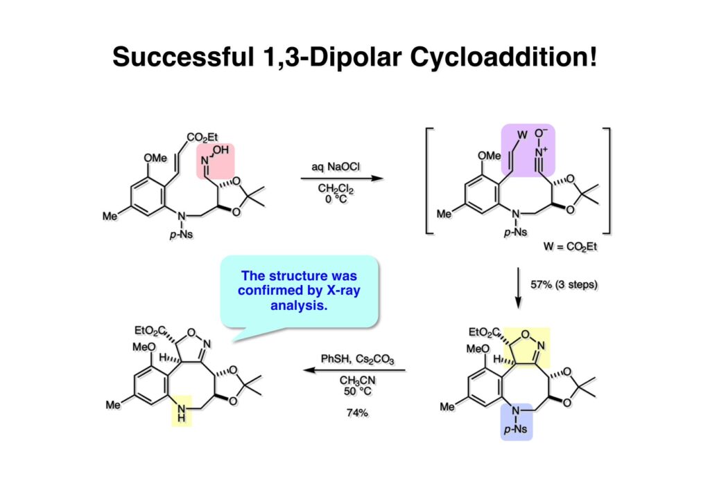 (1-1) を前述したルートでオキシム (2-2) に変換し、1,3-双極子付加環化反応に付したところ、望む8員環化合物は全く得られず、9員環生成物のジアステレオマー混合物が得られてしまった。前述のモデル化合物との違いはオルト位のMeO基による立体障害および電子供与が考えられる。何れにしてもこの問題を解決しなければ先に進めなくなった。