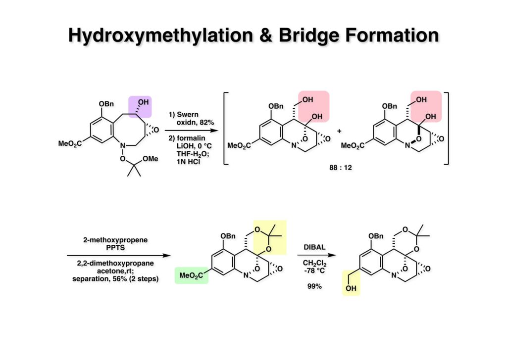 (1-1) の二級水酸基をSwern酸化し、過剰のホルマリン中0度でLiOHと反応させ、更に希塩酸を加えて混合アセトナイドを加水分解したところ88:12の比で渡環生成物 (1-2) と (1-3) が得られた。分離生成することなくアセトナイドに変換後に精製して (2-1) を得た。ここでメチルエステルをDIBAL還元してアルコール (2-2) が得られた。