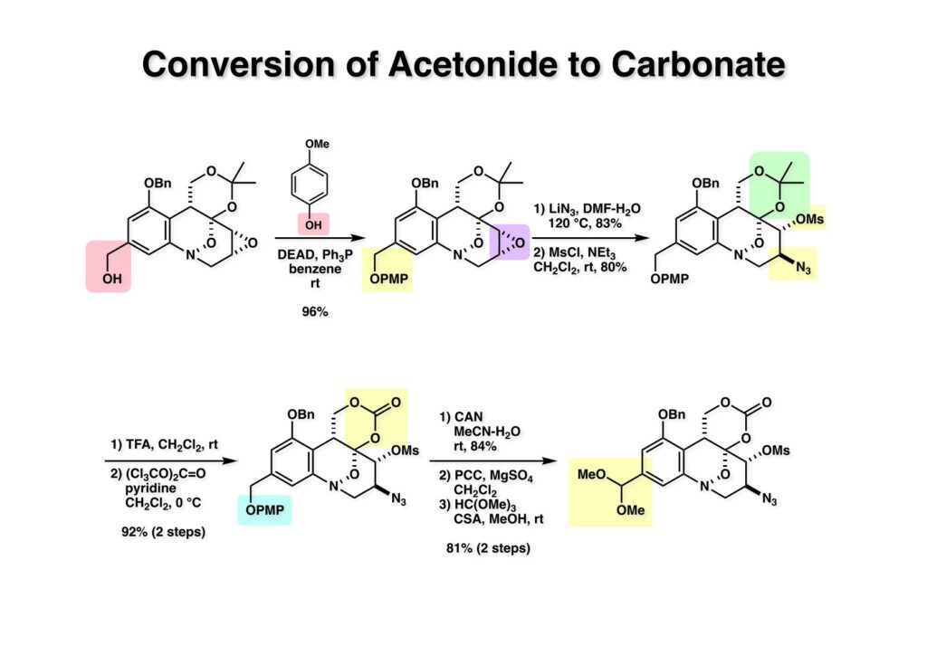 (1-1) の水酸基をp -methoxypheny etherに変換し、エポキサイドをLiN3で開環後にメシル化することによって (1-3) を得た。前述のようにアセトナイド (1-3) を環状炭酸エステル (2-1) し、PMP基のCAN酸化による脱保護、PCC酸化によるアルデヒドへの変換、更にアセタール化して (2-2) が得られた。