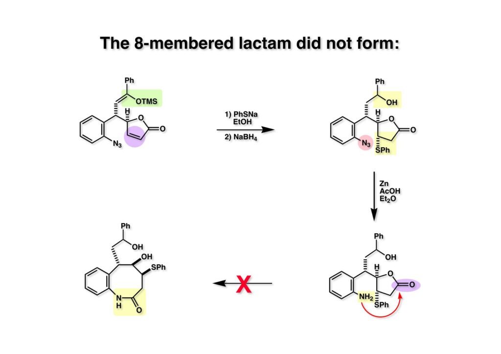 前ページで合成したブテノライド (1-1) の二重結合にアミンがMichael付加しないようにチオフェノールを付加し、さらに生じたケトンも還元して (1-2) を得た。次にアジドを亜鉛還元してアミン (2-2) に導いた。ところが、このアミンから加熱やMe3Alを用いて8員環ラクタム (2-1) に巻き直そうとしたが失敗に終わった。