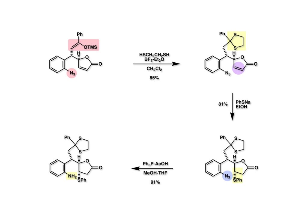 ヒドロキシメチル基は後で導入することにしたので、カルコンは使わずにアルデヒド (1-1) にフラン体 (1-2) を付加させて (1-3) を得た。(1-3) のブテノライドの二重結合をチオフェノールの付加でブロックし、水酸基をアセチル化して (2-2) に変換した。ここでベンジル位のアセトキシ基をEt3SiH-BF3•Et2Oの条件で還元的に除去し、更にアジドを亜鉛で還元して (2-1) を得た。Et3SiH-BF3•Et2Oはカルボカチオンを還元する常套手段で、この場合はオルト位にベンジルオキシ基があるため簡単にベンジル位にカチオンが生成して還元が進行する。酸性条件で使える還元剤と言えばNaBH3CNがあるが、トリルフロロ酢酸中、メタンスルホン酸まで入れて還元に使ったことがある。