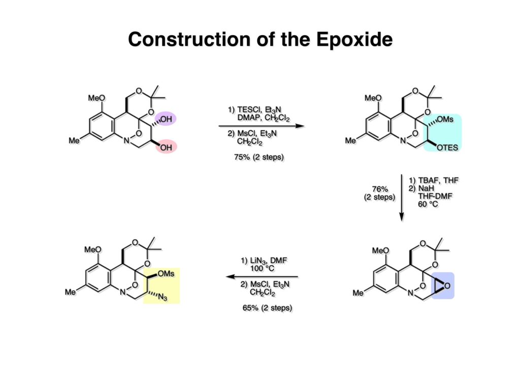 FR-900482のヒドロキシメチル基とアジリジンの相対的立体化学を制御するために、まどろっこしいが必要な操作を行った。まず (1-1) の立体的に空いている水酸基をTES化し、混んだ水酸基をメシル化して (1-2) を得た。次に、TES基をTBAFで外してからNaHで処理するとエポキサイド (2-2) が生成した。エポキサイド (2-2) の開裂はLiN3で行い、生じた水酸基をメシル化して (2-1) が得られた。ジオールの保護をアセトナイドにしているのは環状炭酸エステルがエポキサイド開裂の条件に耐えられないからである。
