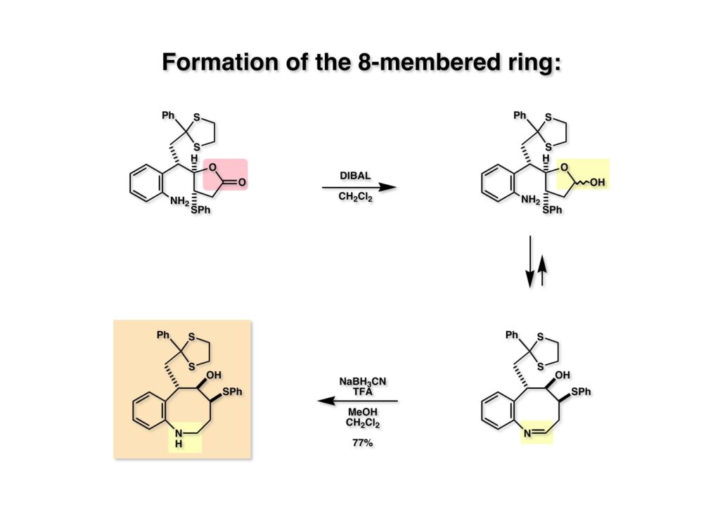 ラクトン (1-1) をDIBALで還元してラクトール (1-2) に変換すると、8員環イミン (2-2) との平衡混合物となり、これをNaBH3CNで還元すると目的とする8員環アミン (2-1) が得られた。
