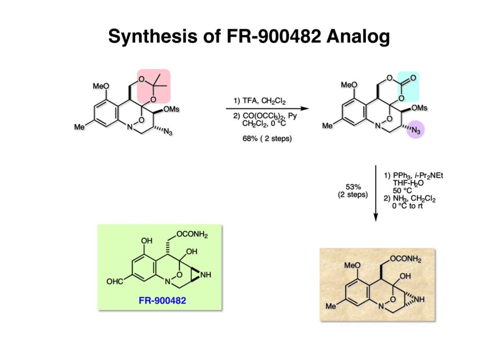 (1-1) のアセトナイドをTFAで加水分解し、得られたジオールをトリホスゲンで環状炭酸エステル (1-2) に変換した。続くStaudinger反応でアジドを還元すると同時にアジリジンが生成し、更にアンモニア処理で環状炭酸エステルを開裂することによりFR-900482類縁体 (2-2) が得られた。