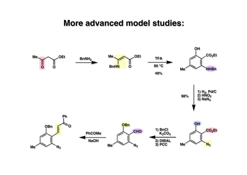 今はSciFinderを使ってお茶の子さいさいで化合物が検索できるが、昔はChemical AbstractsのCollective Indexを用いて賢い探し方をしないと良い化合物は見つからなかった。そういう意味で、出来る学生を図書館に送れば、そんなに時間をかけなくても良い調査結果を持って帰ってくるが、出来ない学生を送り込むといつまで待っても戻ってこない、というところで学生の評価が分かれるのであったが…。SciFinderの検索でも上手な学生は良質な情報を探してくるが、下手な学生は玉石混交で何でも引っかかる物を集めてくる。この辺りにもセンスというものが問われるのだ。昔、よく学生に言っていたが、教師は有機化学の基本を教えることは出来るが、「センスは教えられない」ってね。ところで、このページの反応はベンジルアミンでなく、プロピルアミンを使っていた論文を見つけることができたのが元になっている。 市販のアセト酢酸エチル (1-1) とベンジルアミンを常法により縮合し (1-2) に変換し、これをトリフロロ酢酸中で加熱するとベンゼン環を有する化合物 (1-3) が得られた。(1-3) のベンジル基を加水素分解で外し、常法によってアジド (2-3) に変換した。次に、(2-3) のフェノールをベンジル化し、エチルエステルをDIBALでアルコールまで還元後にPCC酸化でアルデヒド (2-2) に導いた。これをアセトフェノンと縮合してカルコン (2-1) を得た。