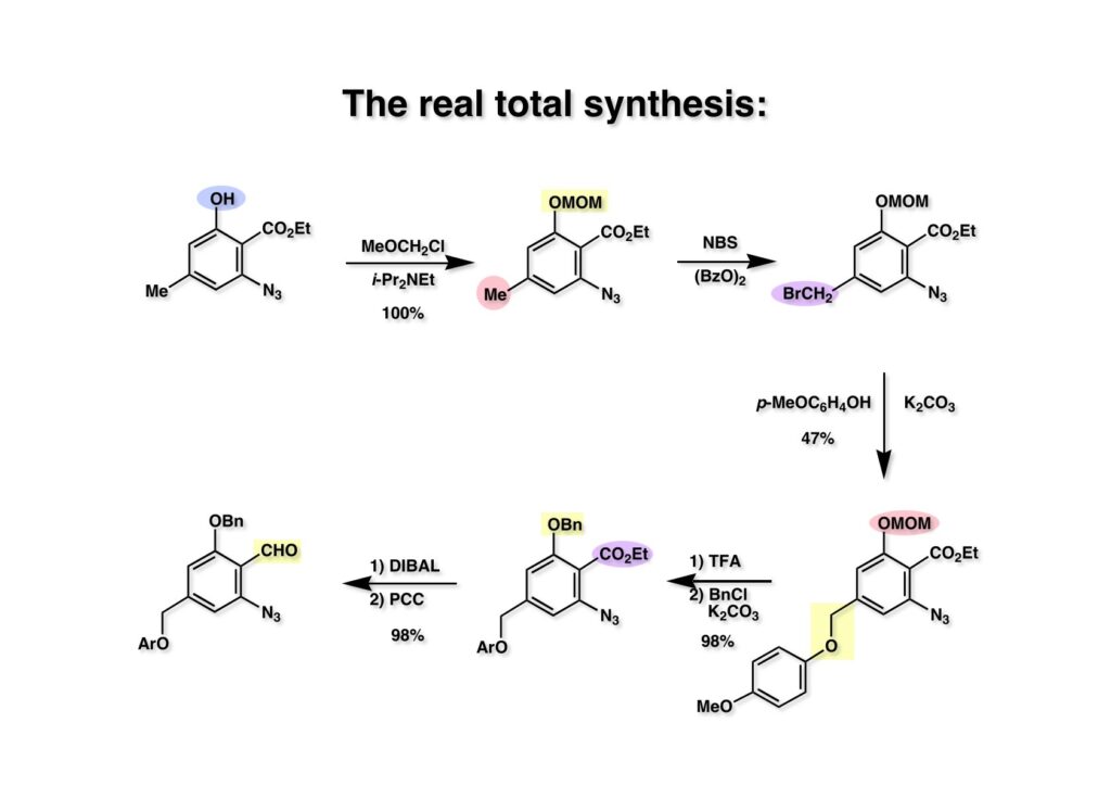 さて、ここからはFR-900482の全合成につながったルートについて説明していく。まず (1-1) のフェノールをMOM基で保護し、得られた (1-2) のメチル基をNBSでブロモ化して (1-3) を得た。次いで、p -メトキシフェノールと炭酸カリでp -methoxyphenoxy基を導入した。得られた (2-3) のMOM基をTFAで外し、ベンジル化して (2-2) を得た。次にエステルのDIBALによる還元(LAHを使うとアジドが還元される)と続くPCCによる酸化でアルデヒド (2-1) に導いた。
