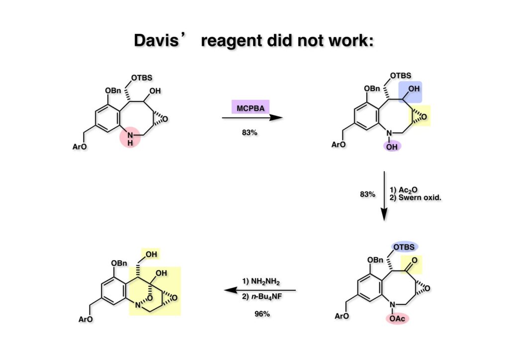 2級アミンを酸化してヒドロキシルアミンに変換する方法はそれほど多くは知られていない。(1-1) の酸化ではDavis試薬 (1-2) が一番良い結果を与え、望むヒドロキシルアミン (1-3) が高収率で得られた。次いで、酸性度の大きいヒドロキシルアミンを無水酢酸のみでアセチル化し、次にアリルアルコールをSwern酸化してケトン体 (2-3) を得た。続くアセテートの加水分解条件では望む渡環体 (2-2) と脱酢酸後に環化脱水してフラン化した生成物 (2-1) との混合物が得られてしまった。