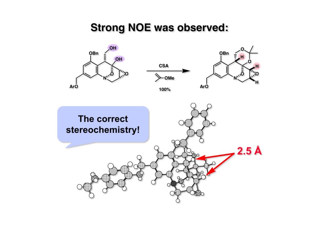 ジオール (1-1) をアセトナイド (1-2) に変換してNOEを測定したところ、ピンクでマークしたプロトンに強いNOEが観測されて図のような構造が証明された。
