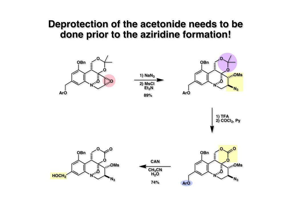 エポキサイド (1-1) は比較的反応性が低く、過剰のNaN3を用いDMF中120度6時間加熱という条件で開裂が完了し、水酸基をメシル化して (1-2) を得た。先行実験でアジリジン構築後は酸性条件に非常に不安定で、アセトナイドもMPM基も外せないことが判明していた。そこで (1-2) のアセトナイドをTFAで外してからホスゲンを用いて環状カーボネート (2-2) に変換した。(2-2) のMPM基は含水アセトニトリル中でCANを作用させると一級アルコール体 (2-1) が (1-2) から通算収率74%で得られた。