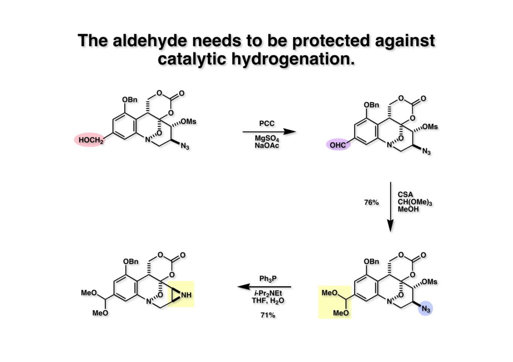 (1-1) のベンジルアルコールをPCC酸化してアルデヒド (1-2) に変換した。芳香族アルデヒドは接触還元の条件で還元されやすいので、(1-2) はジメチルアセタール (2-2) として保護しておいた。次にアジドをPh3Pを用いてStaudinger反応を行ったところ、アジリジン (2-1) が直接生成した。