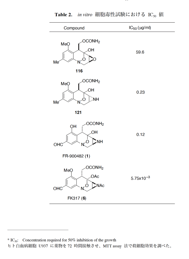 この研究をメインに行った陰性の神戸美香の修士論文からFR-900482類縁体のヒト白血病細胞への細胞毒性試験の結果を引用する。ご覧のようにアジリジンの絶対配置がFR-900482と反対にも関わらずほぼ同じ活性を示したのは注目に値する。以前、マイトマイシンCの鏡像異性体をニューヨーク市大のMaria Tomaszに送ったがMMCの半分くらいの活性があるとの報告があった事を思い出す。