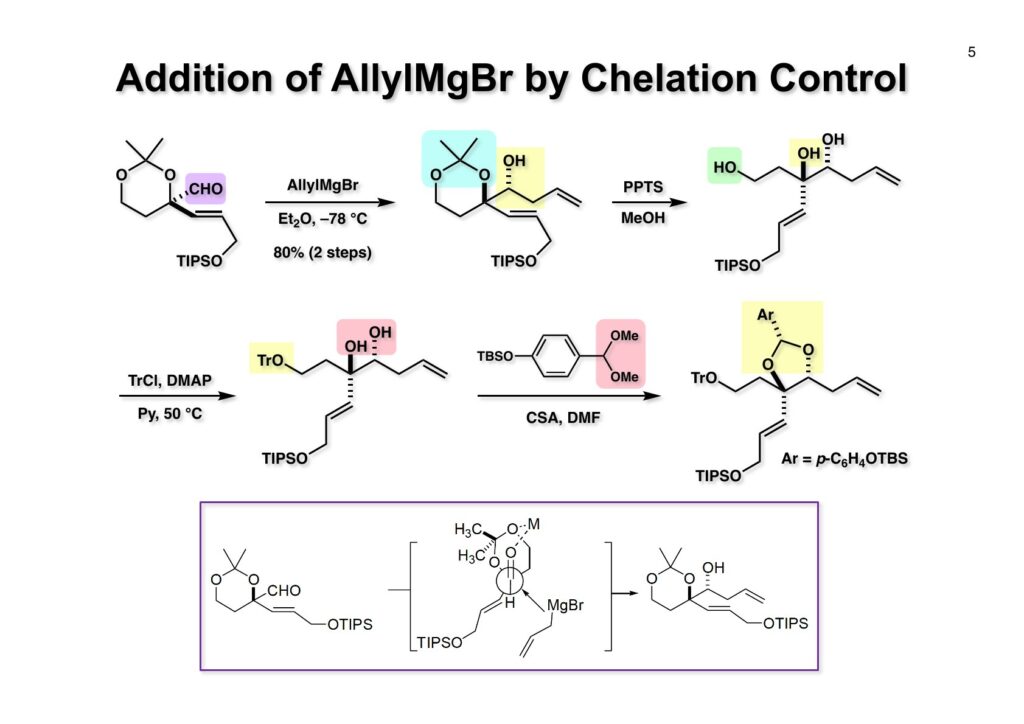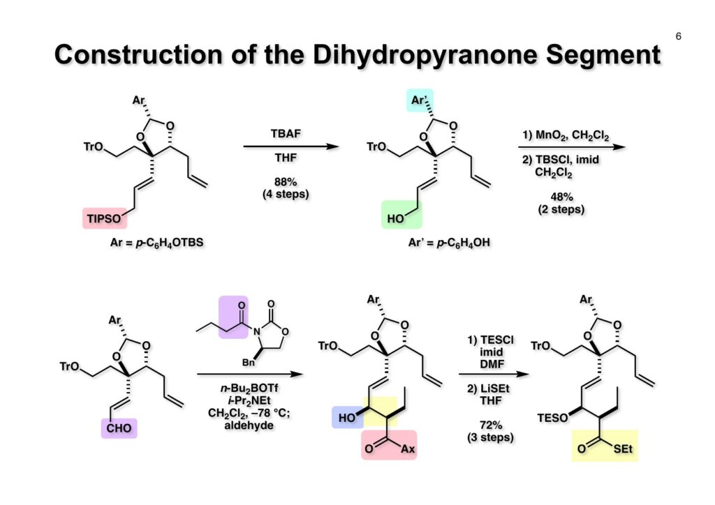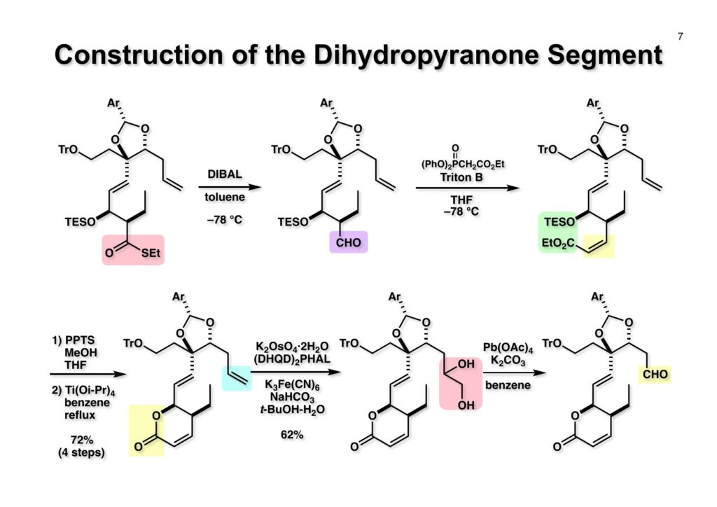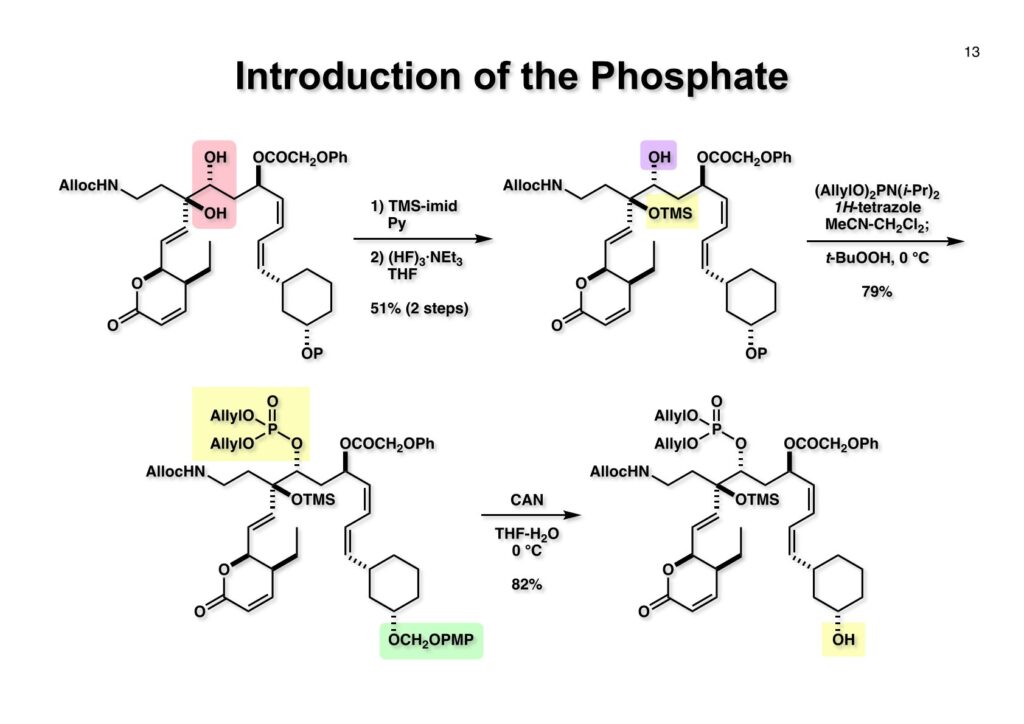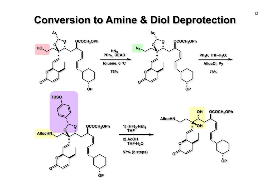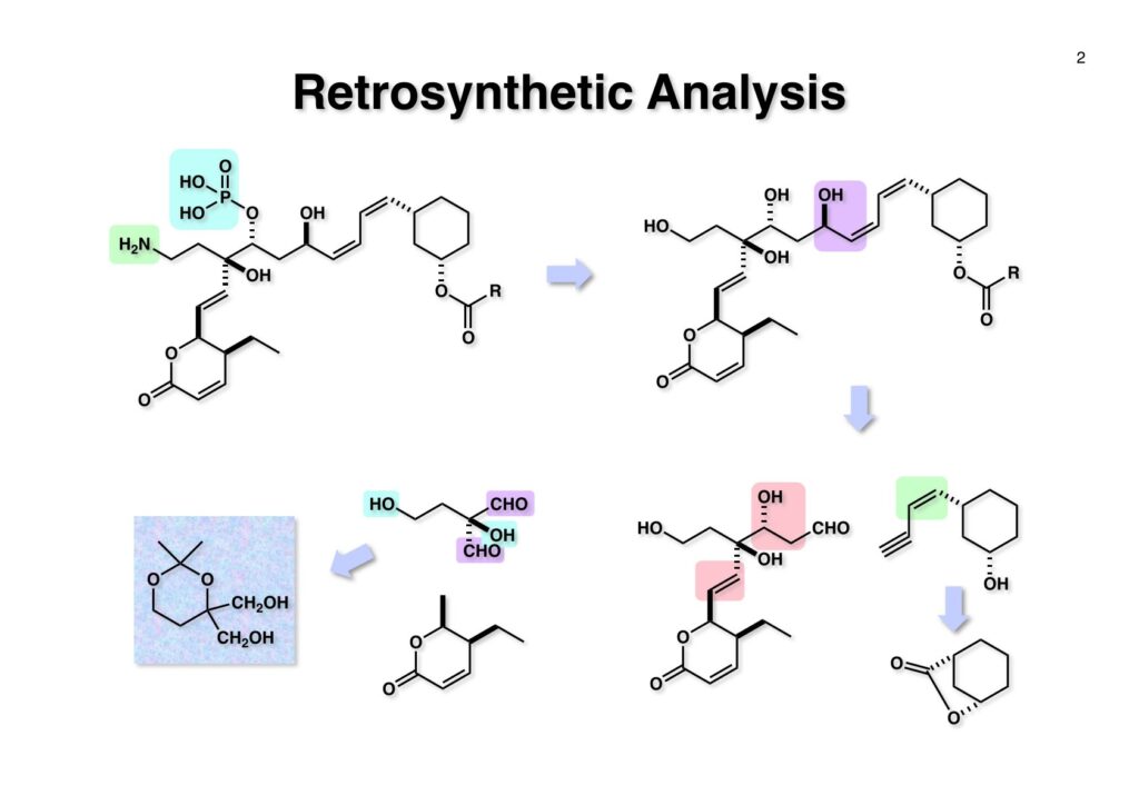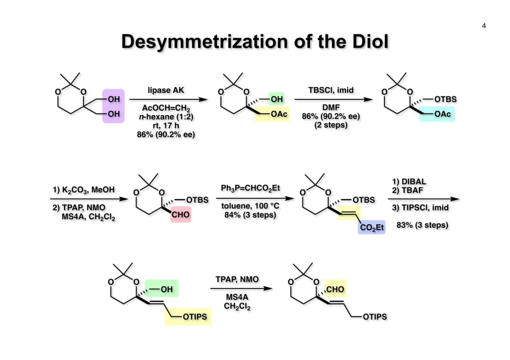 逆合成解析を簡単に示すが、まず (1-1) のアミノ基やリン酸基は合成途上で邪魔になるので、なるべく全合成の後半に導入することにしたい。次に (1-2) を眺めてみると、ジエンはcis-cisなのでアセチレンの還元で立体化学を制御できるし、アセチリドのアルデヒドへの付加ではキレーション制御で水酸基の立体化学を制御できる可能性がある。従って 、(1-2) は (2-3) と (2-4) に分割することができる。(2-4) の置換基のcis配置は (3-2) のようなラクトンから導くことを期待した。(2-3) のβ-ヒドロキシアルデヒドとジヒドロピラノン部分はいずれも (2-2) のアルデヒドから構築できると考えれば (2-1) のようなジオール体が重要な出発点となることが考えられる。この化合物は対象面と4置換炭素を有しており、不斉合成では非対称化が困難で、すぐに思い浮かんだのは酵素にお願いすることだった。