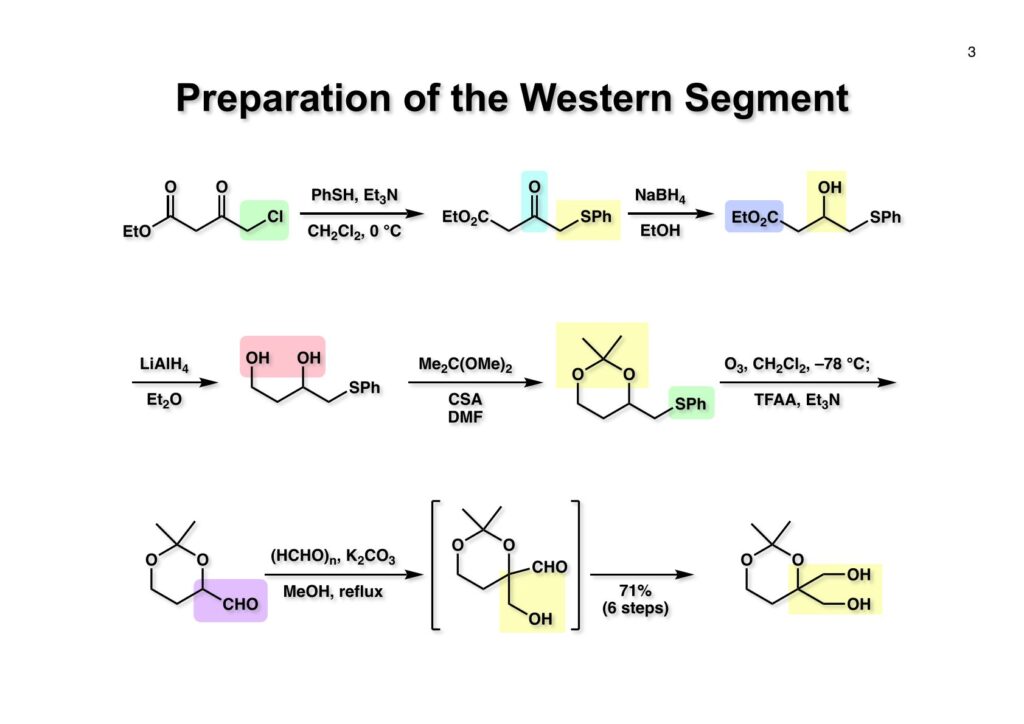 少々まどろっこしいが、左側のパート (3-3) は大量合成が容易にできるルートをデザインした。まず比較的廉価なethyl 4-chloroacetoacetate (1-1) をチオフェノールとEt3Nでサルファイド (1-2) に変換し、ケトンをNaBH4還元してアルコール (1-3) を得た。次にエステルをLAH還元してジオール (2-1) にしてからアセトナイド (2-2) で保護した。次はスルホキサイドにしてからPummerer転位をするのだが酸化にはオゾンを用いた。NaIO4では遅すぎるし、MCPBAでは注意深くやらないとスルホンが副生してしまう。オゾンを用いると低温下では付加体が生成してそれ以上反応が起きず、昇温することでスルホキサイドとおそらく一重項酸素が生成すると思われる。ハーバード大学のPaul Bartlett教授(講義を受講したことがある)は(PhO)3Pに低温下でオゾンを反応させて(PhO)3PO3にし、昇温することで一重項酸素を発生させていた。オゾン酸化はCH2Cl2を溶媒にし、後処理の必要が無いので、昇温後に無水トリフロロ酢酸とEt3Nを加えて後処理するだけでアルデヒド (3-1) が得られる。これをメタノール中で過剰のパラホルムアルデヒドとK2CO3で加熱環流すると、まずヒドロキシメチル化で (3-2) が生成し、次にCannizzaro反応でアルデヒドが還元されて目的とするビスヒドロキシメチル体 (3-3) が (1-1) から71%の通算収率で得られた。