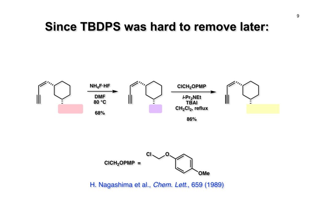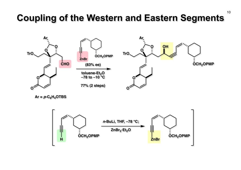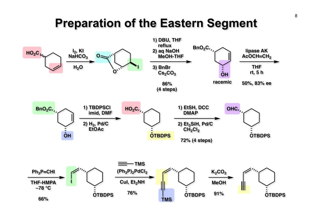 Leustroducsin Bは血小板増多作用を持つ新規抗生物質として三共株式会社で放線菌から単離構造決定された化合物である。東大薬の廣部雅昭先生の研究室で修士号を取得後、三共の研究員をしていた島田神生さんが私の研究室に2年間研究生として来られることになった。経緯は忘れてしまったが島田さんがこの化合物の全合成をやりたいと言ったのだと思う。私が含窒素天然物全合成の専門家と言っても、leustroducsin Bにはアミノ基が一個あるだけなのでほぼ専門外の化合物と言って良い。この天然物は酸にもアルカリにも弱く、保護基をどのように使うかというのが課題となった。一人で2年以内に完成させるのはさすがに厳しかったので、後半は修士課程の学生だった鏑木洋介君に助太刀をしてもらい完成に漕ぎ着けた。