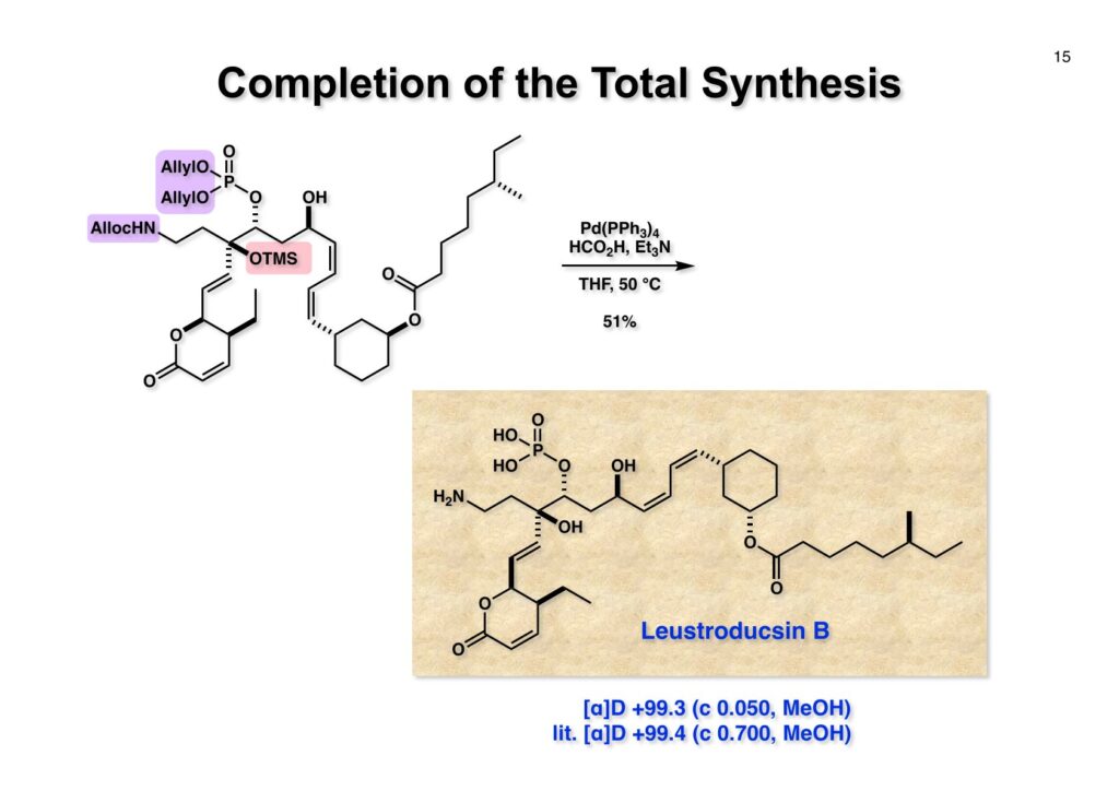 最終段階は (1-1) 中の3個のアリル基をPd触媒とギ酸-Et3Nを用いて除去する反応で、THF中50 °Cで加熱するうちにTMS基も除去されてleustroducsin B (2-1) が得られて全合成は完了した。旋光度も標準標品と良い一致を示した。私としてはちょっと毛色の違う化合物を、島田さんや鏑木君と試行錯誤を重ねながら経験を積んでいった教育的な研究だったと言える。