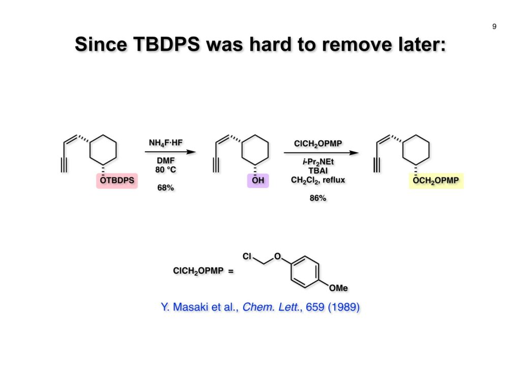 全合成終盤になってからTBDPS基の脱保護が困難であることが判明したので、酸性条件で安定なPMPOCH2基に付け替えることにした。この保護基は岐阜薬科大学の正木幸雄先生が報告したもので、PMPO基がCANによって簡単に脱保護できることは私たちが以前に報告していたが、光延反応によって導入していたので1級アルコールの保護にしか使えなかった(プロカイラルな2級アルコールは立体化学が反転してしまうので)。それをPMPOCH2基に転用するという発想が私には無かった。もちろんPMPO基の強酸に対する安定性は比類がないが。(1-1) のTBDPS基を脱保護し、得られたアルコール (1-2) を報告された条件を用いてPMPOCH2エーテル (1-3) に変換した。