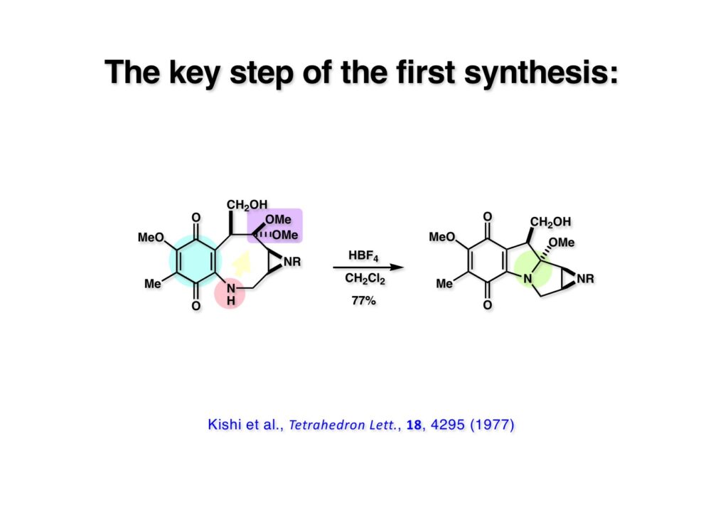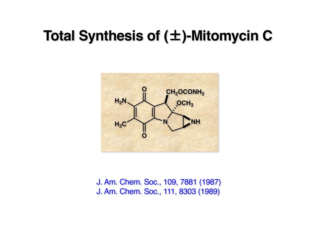 Mitomycin C(MMC)は1955年に北里研究所で発見され、1958年に協和発酵で結晶として単離された抗がん剤で、現在も臨床的に使われている。低分子で合成がそれほど難しくないと思いがちで数々の合成研究が報告されてきたが、現在までに恩師の岸義人先生とライス大学在籍時の私の研究室でしか全合成に成功していない。1977年1月20日にハーバード大学で博士口述試験を終えた翌日に岸先生のオフィスに呼ばれ、MMCの全合成を3名のポスドクがやっているが、なかなか終わらないので、とにかく終わっらせてほしいと頼まれた。半年ほど頑張って全合成は完成したが、多段階合成でとにかく終わらせた、という感じだった。Mitomycin A(MMA)はキノン部分のアミノ基がメトキシ基になっている化合物で、アンモニアを通ずると簡単にMMCに変換できる。最初にMMAを合成した時は1.5 mgの中間体から5段階で到達したのだが、MMAのキノン骨格を持つ化合物は綺麗な紫色なので、TLC上で追跡するのは簡単だった。合成されたMMAはおそらく0.5 mg以下だったと思うが、ハーバードの80 MHzのNMRではメチル基のシグナルが3本天然物と一致したのと、TLCも同じRfだったことで合成ができたことが分かった。勿論、最終的にはスケールアプして論文を報告している。MMCの色は濃紺でMMAの高貴な色の方が感じが良かった。ま、とにかくライス大学に移ってからも、もっと効率的な合成ルートがあるはずだ、と思いつつ、なかなか全合成に着手したいと思うようなアイデアが浮かばなかった。