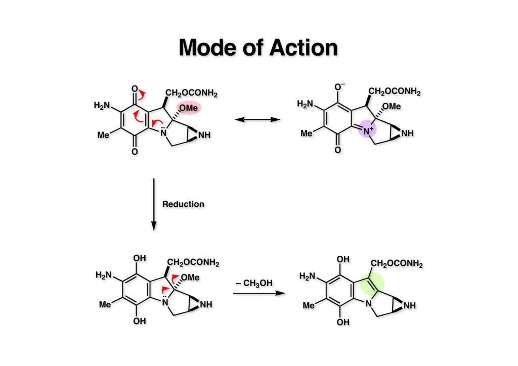 MMC (1-1) が天然に存在するほど安定なのはキノン構造を持っているからで、キノンに結合した三級アミンはvinylogous amideとなっているので孤立電子対によるMeO基の追い出しには効果的でない。ところが生体内でMMCが還元されて芳香環 (2-1) になると、たちまち脱メタノール化が進行してインドール (2-2) になってしまう。
