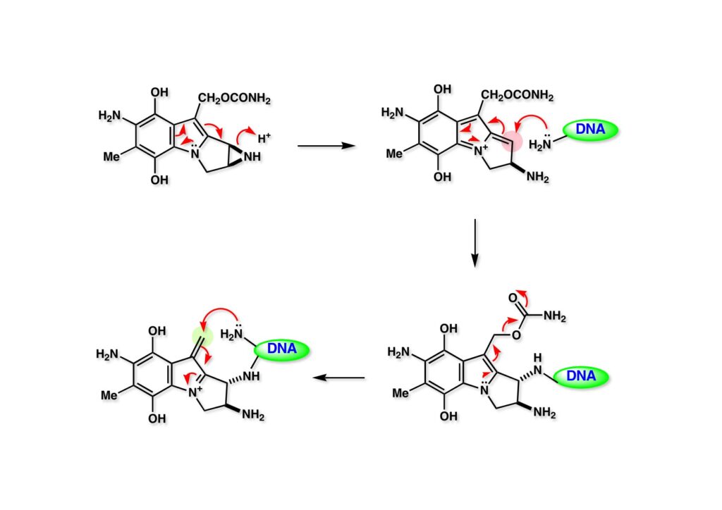インドール (1-1) のアジリジン窒素原子がプロトン化されるとアジリジン環の開裂が即座に進行し、生じた活性種 (1-2) がDNAのC-G, G-Cペアのグアニンのアミノ基を攻撃する。次いで、インドール上の窒素の孤立電子対の押し出しによってカーバメートが脱離し、対面のグアニンを攻撃する。