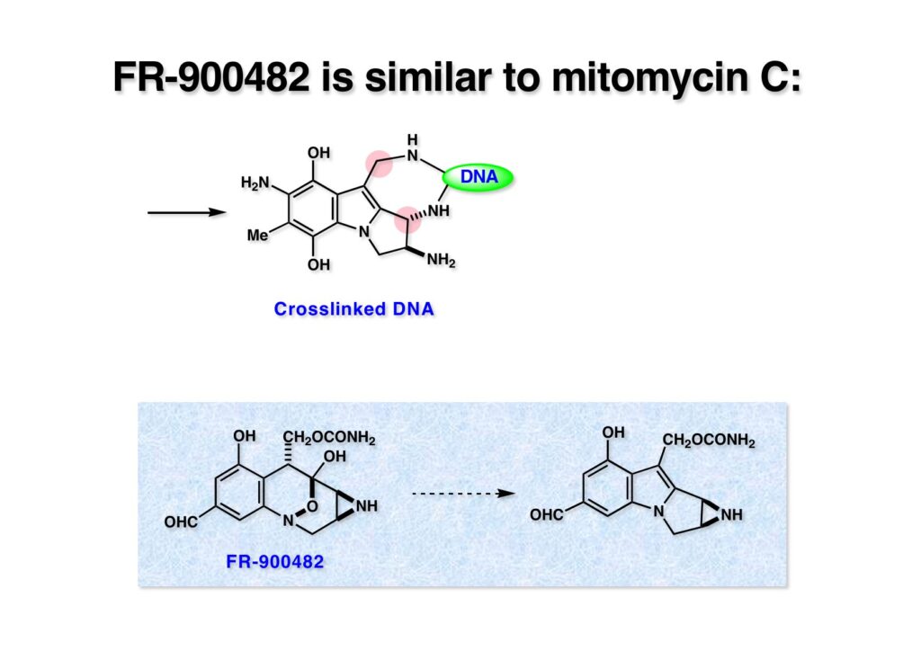 こうしてDNAの二重鎖が架橋されて複製不能になるのがMMCの作用機構である。このメカニズムの化学的証明はニューヨーク市大のMaria Tomaszとコロンビア大学の中西香爾先生の共同研究で行われた。Greg Verdineは中西研の院生としてこの研究に従事した。後に藤沢薬品で単離構造決定されたFR-900482もMMCと同様の作用機構でDNAをcross-linkingすることが知られている。この化合物の全合成も私たちの研究室で達成したので後述することになる。