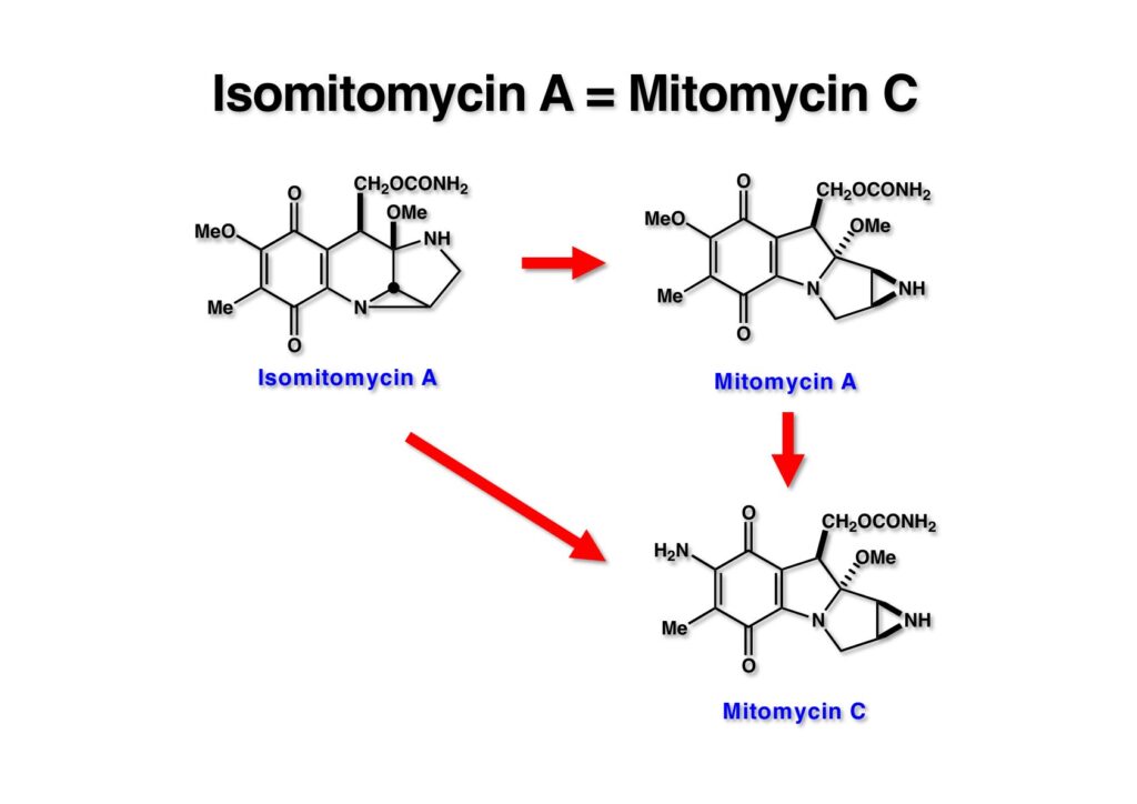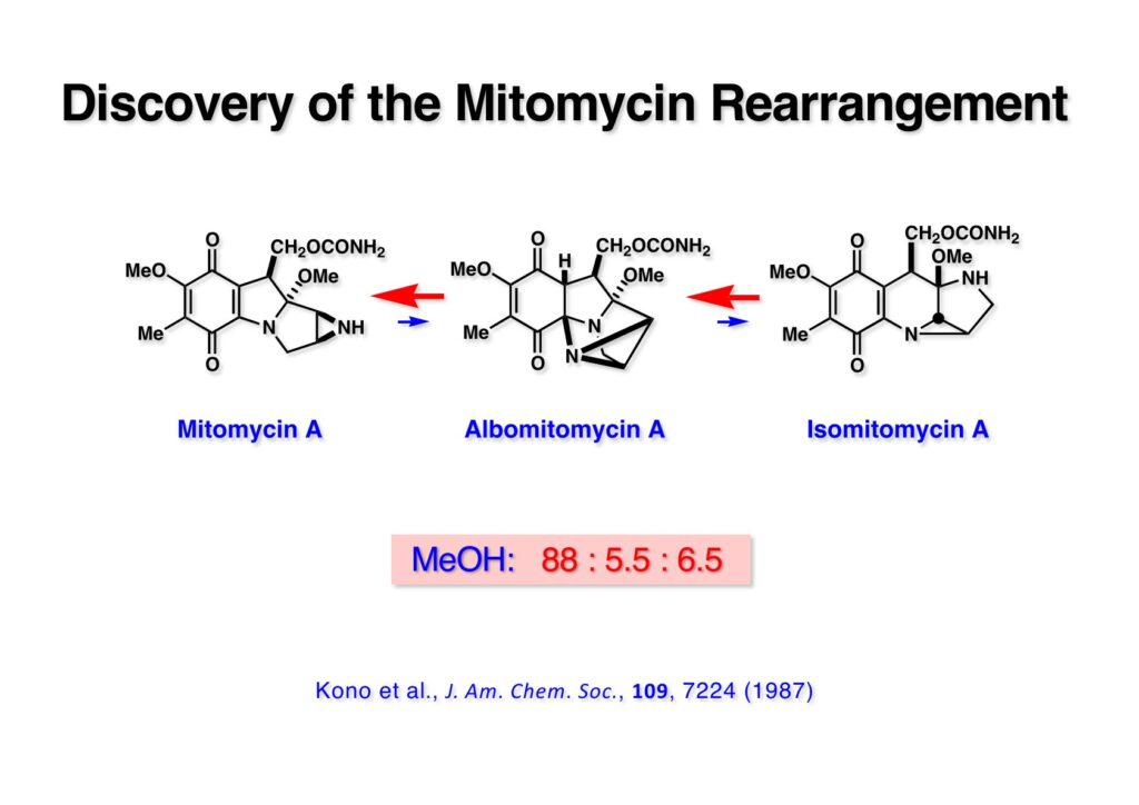 1985年の年末に三共株式会社の杉村征夫さんからクリスマスカードが送られてきて、カードの間にその年の天然有機化合物討論会の講演要旨が挟まっていた。杉村さんは毎年天然物討論会に出席した同僚の要らなくなった要旨集を私に郵送してくれていた。その年は要旨集が手に入らなかったけれど、面白い講演があったのでそのページをコピーして送って下さったのだ。それを見た瞬間「ガーン」と頭を打たれたような衝撃が走った。何と!協和発酵の研究者が「マイトマイシン転位」を報告していたのだ!彼らはisomitomycin A (IMMA, 1-3) がalbomitomycin A (AMMA, 1-2) を経由してmitomycin A (MMA, 1-1) に変換でき、平衡混合物の比は左から 88:5.5:6.5 となっていた。