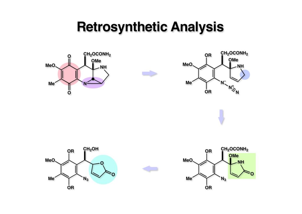 早速IMMA (1-1) の逆合成解析に着手した。まず、キノンは芳香環として保護をし、アジリジンの構築はオレフィンとアジドの1,3-双極子付加とそれに続く窒素の脱離によって構築することとして (1-2) に導いた。この反応は時としてイミンが主生成物になる可能性もあるが、その時はその時でまた考えることにした。(1-2) の構造ではすぐにメタノールが脱離してピロールになってしまうので、それを防ぐためにカルボニル基を環上に配置して (2-2) とした。(2-2) のピロリノン環では炭素-炭素結合が作りにくいので、より簡単なブテノライド (2-1) をピロリノンの前駆体とした。