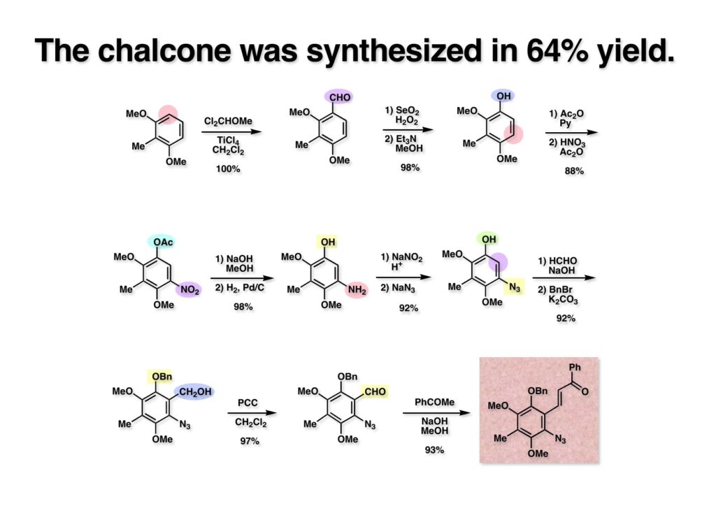 ここに示したカルコン (3-3) の合成は38歳の私が最後に行った実験である。市販の2,6-dimethoxytoluene (1-1) 25 gをFriedel-Crafts反応でアルデヒド (1-2) に変換した。Bicyclomycinの全合成の時に述べたが、このスケールでMCPBAを用いると後処理が面倒なので、アルデヒドと触媒量のSeO2のt-BuOH溶液に50度を超えないように30% H2O2を滴下していくとギ酸エステルが高収率で得られる。これを分液後に蒸留乾固し、精製することなくメタノール中でEt3Nを加えてフェノール (1-3) を得た。次に、フェノールをアセチル化して保護し、無水酢酸と硝酸の混合液でニトロ化すると (2-1) が得られる。アセテートはちょっとEt3N-MeOHの条件では落ちないので、普通に加水分解し、耐圧容器中でPd/Cを触媒に高圧水添すると短時間でアミン (2-2) 得られる。このアニリン (2-2) からアジド (2-3) への変換は非常に簡単で、まず常法でジアゾニウム塩を作り、それにNaN3を加えていくと窒素ガスがブクブクと出てくるが、泡が出終わったら反応終了である。フェノールのホルマリンによるヒドロキシメチル化は、位置選択的に反応させるのが特殊例を除いて困難であるが、この場合はオルト位が一箇所空いているだけなので簡単に生成物が得られる。フェノールのベンジル化は当然aliphatic alcoholが存在しても選択的に進行し (3-1) を得た。この頃になってくると不純物も目立つようになったが、スケールが多少大きいのでカラム精製はなるべく先送りするつもりだった。次ステップのアルコールのPCC酸化でアルデヒド (3-2) は得られたもののカラム精製したくなるくらい不純物が増加してきた。しかしカルコンまで到達してから精製する事にして、アルデヒド (3-2) とPhCOMeをメタノールに溶かして、攪拌しながらNaOH水溶液を加えていったところ、キラキラ光る結晶が現れてきた。反応終了後に結晶を濾過乾燥して収率を計算したところ、1週間かけて12段階で通算収率が49%であった。学生たちに私が昔は如何に実験の腕が良かったかを自慢するネタである。このカルコンを使って、合成を始めて1年と数日でMMCの全合成は完成した。Lihuがこのカルコンはどうやって合成したのか?って聞きにきたが、何しろ頭の中の常識を使って合成経路を考えたのと、少々忙しかったのと面倒臭がりのせいで、全く私の実験ノートに記録してなかった。慌ててルートを紙に書いてやり、適当に反応条件を教えてやったら3週間ほどで合成ルートが再現できた。Lihuは私に勝とうとして、同じスケールでカルコンを合成したが、通算収率は46%で軍配は私に上がった。