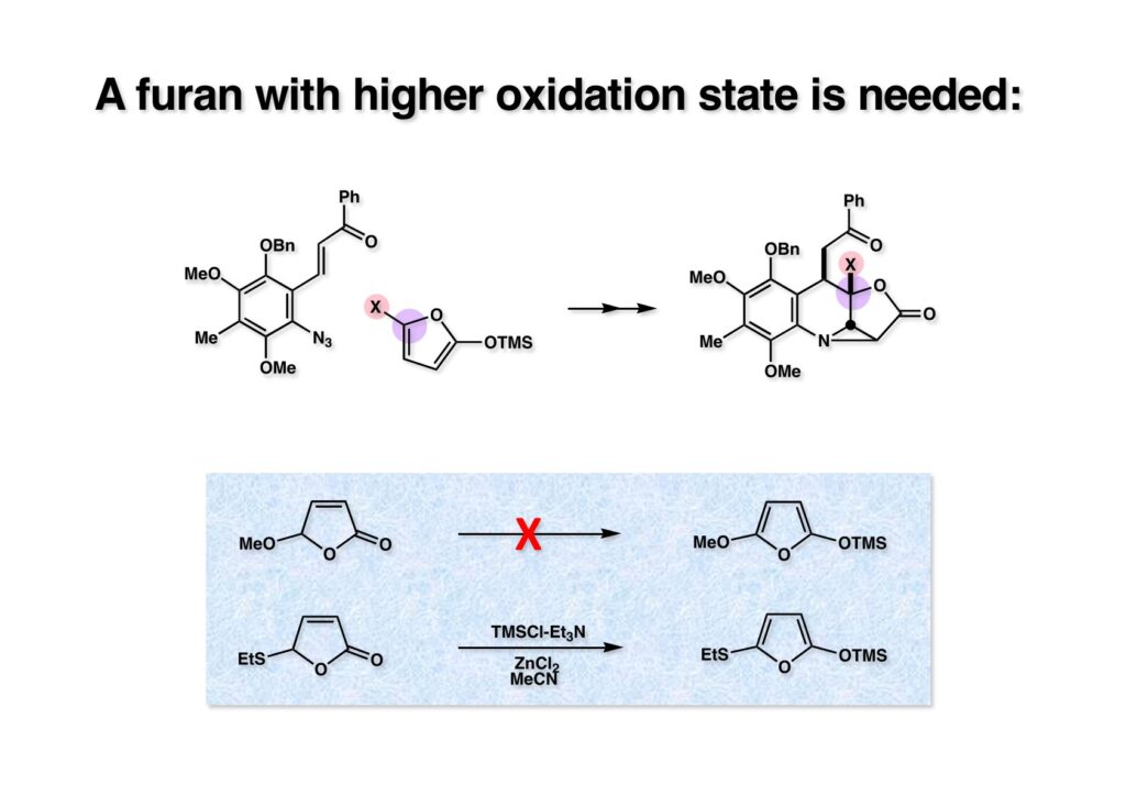 アジリジン (1-1) をEtOHで開裂して (1-2) にしたが、水で開館してメシレートにすると、すぐに閉館してアジリジンに戻ることは確認済みで、EtO基は後で除去可能なアルコールにする予定だった。(1-2) のラクトンはアンモニアで開裂してアミド (2-2) を与えた。ここで水酸基を酸化してケトン (2-1) に変換しようとしたが、何をやっても分解してしまい望むケトンは得られなかった。当然、(1-1) の段階でラクトンの加アンモニア分解は行っているはずで、多分解列しなかったのだと思う。とにかく、(1-2) のアミンが全く保護できなかったのが痛かった。今から思えば、(2-2) でエチル基の代わりに水酸基にして何とかアジリジンに戻してからケトンへの酸化を試みれば良かったかもしれない。ま、それはそれで回りくどいルートになっていただろうけど。結局、フランの5位にヘテロ原子を導入することで、後の酸化を不必要にするアイデアを実行することにした。