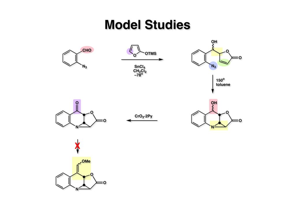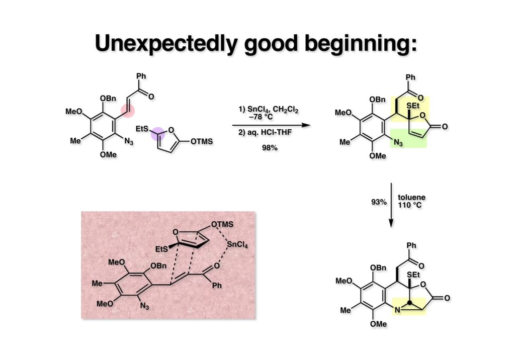 アジドとオレフィンの環化付加反応の例を探しに図書館に行き、Chemical Abstractsを調べたところ、 (2-1) をトルエン中で還流すると高収率でアジリジン (2-3) が生成するという報告があった。今ならSciFinderであっという間に探せるのだが、昔はこれを探すのも容易ではなかった。とにかくこの論文を見た時にMMCの全合成は終わったような気になったのは確かである。