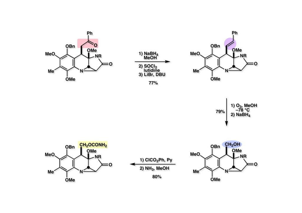 さて、次の仕事は全合成前期に重要な役割を果たしたカルコンの残骸であるフェナシル基をヒドロキシメチル基に変換することである。ケトン (1-1) を還元して、水酸基を塩化チオニルで脱水しようとしたが、クロライドになっただけだった。そこで LiBr存在下にDBUで加熱したところオレフィン (1-2) が得られた。オレフィン (1-2) にメタノール中低温でオゾンを通じたのち、NaBH4を加えてヒドロキシメチル体 (2-2) を得た。次いで、PhOCOCl-Pyで混合炭酸エステルとし、これを加アンモニア分解してカルバメート (2-1) に変換した。