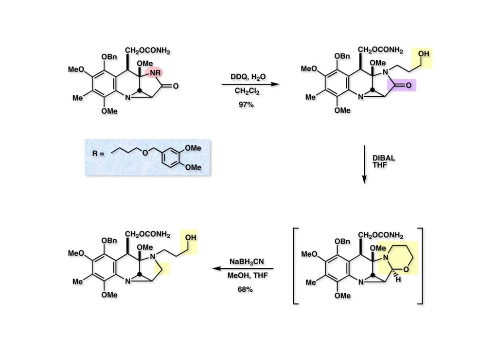 3,4-Dimethoxybenzyl基は北大薬の及川、米光により報告されたアルコールの保護機で、DDQ酸化により容易に除去できる。(1-1) の保護基の保護基を外して (1-2) をまず得た。これをDIBAL還元すると、通常のN-アルキル基なら直接アミンにまで還元されるが、水酸基が存在するので1,3-oxazinane (2-2) で反応が止まってしまう。仕方ないので、反応溶液にメタノールとNaBH3CNを加えてアミン (2-1) を得た。