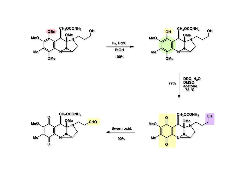 次に芳香環を酸化してキノンに変換するステージがやってきた。(1-1) のベンジルエーテルは接触還元で容易に除去でき、フェノール (1-2) が定量的に得られた。イソマイトマイシンはマイトマイシンに比べると酸性条件に弱いと記述したが、(1-2) のDDQ酸化の条件でも常温で反応させると分解が部分的に起こる。そのため、低温下で酸化する必要があるが、(1-2) がアセトンに溶けにくかったのでDMSOを補助溶媒に用いたところ、p-キノン/o-キノンの比が改善され、(2-2) の収率も向上した。(注)DDQは酸化することによりジフェノールになるが環上にシアノ基やクロル基などの電子吸引基が存在しているため、フェノールよりは酸性度の大きい酸と言える。