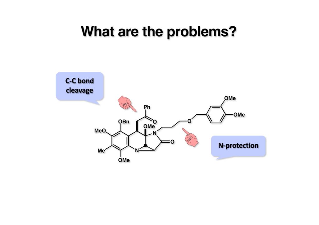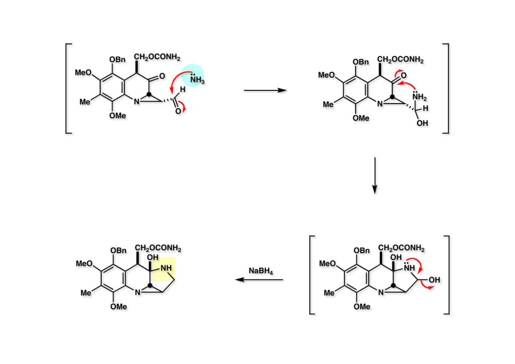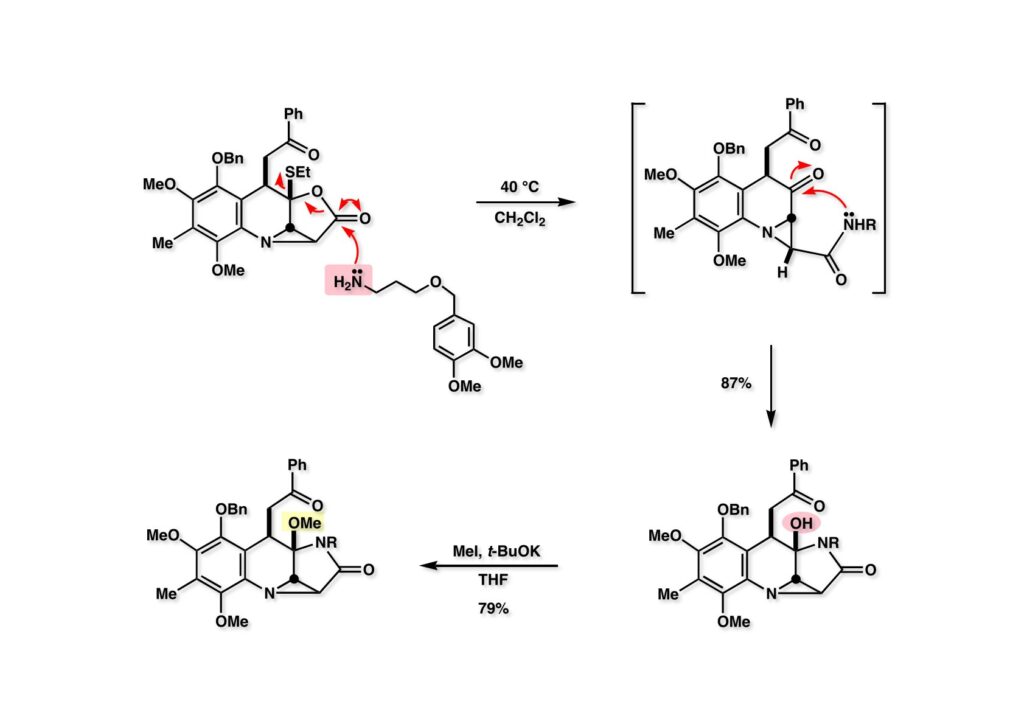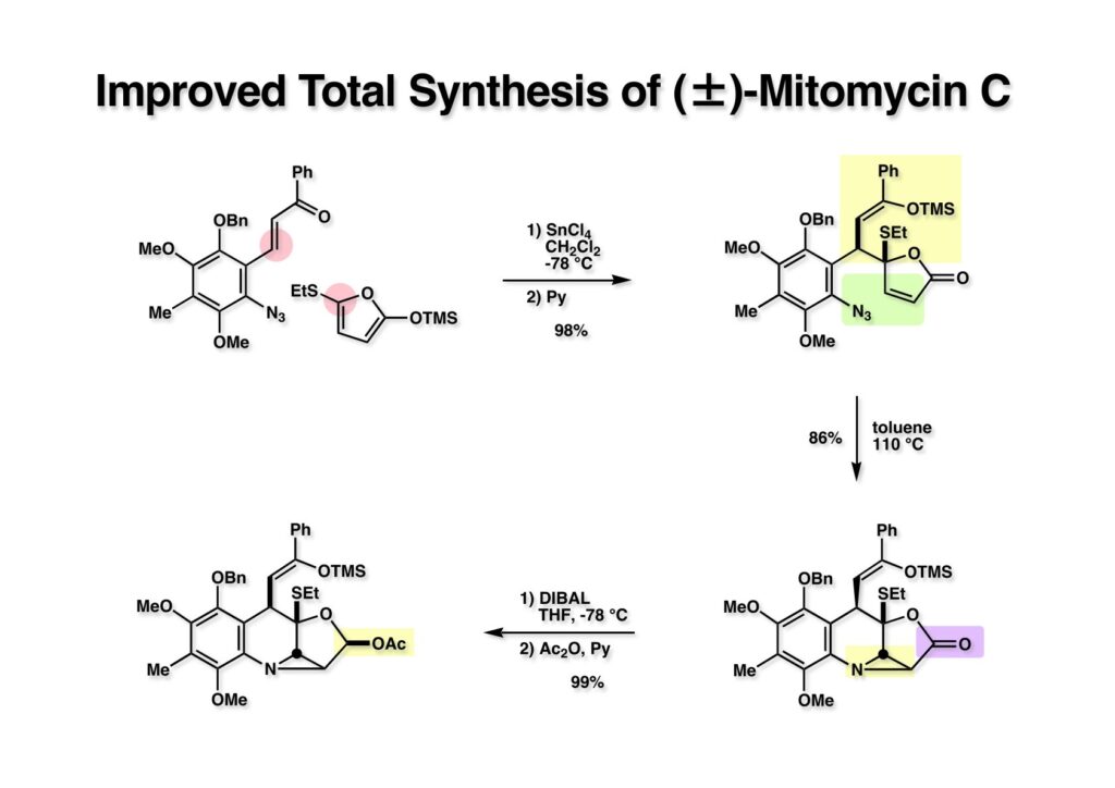 マイトマイシン転位は協和発酵の報告どおり、IMMA (1-1) を1当量のAl(OPr-i)3存在下でメタノール中室温で4日間放置することで、MMA (1-2)を高収率で得ることができた。最後にMMA (1-2) のメタノール溶液にアンモニアのメタノール溶液を加えることでマイトマイシンC (2-1) の全合成が完成した。大学院1年生のLihu Yangを毎日突っつきながら、全合成開始後1年と数日でMMCの全合成は終わったが、まだまだ改良したい点があって、直ちに第二世代の全合成に着手するようにLihuに伝えた。