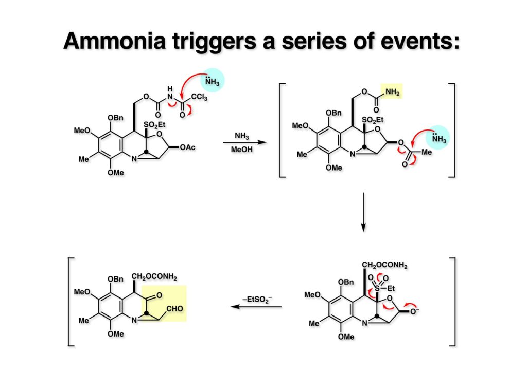 さて、次のスキームは流れるように進行して、私の計画通りだと自己満足している。(1-1) をメタノール中アンモニアで処理すると、まずトリクロロアセチル基が脱落する。次に (1-2) のアセチル基が加アンモニア分解されてラクトール (2-2) が生成するがEtSO2- (ehtyl sulfinate)が効果的な脱離基となってケトアルデヒド (2-1) になる。