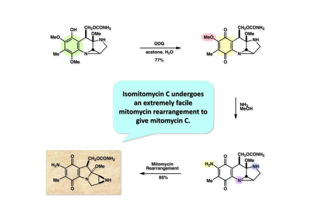 フェノール (1-1) を低温下DDQ酸化してイソマイトマイシンA (1-2) を得た。以前、協和発酵の担当者にイソマイトマイシンCを見たことがあるか尋ねたところ、それらしき化合物があると思ってTLCで分離しようと思ったらマイトマイシンCになっていた、との返事があった。これはマイトマイシン転位が非常に早いのではと思い、イソマイトマイシンA (1-2) をメタノールに溶かしてアンモニアを加え、数時間室温で放置したところマイトマイシンC (2-1) が高収率で得られた。イソマイトマイシンC (2-2) は幻の化合物でその存在を認めるには至らなかった。マイトマイシンCの全合成は1年半で完成し、それほど必死に努力したわけでもなかったのに高評価が得られた。この世界、苦労すれば苦労しただけ報われる、っていうわけでもないね。