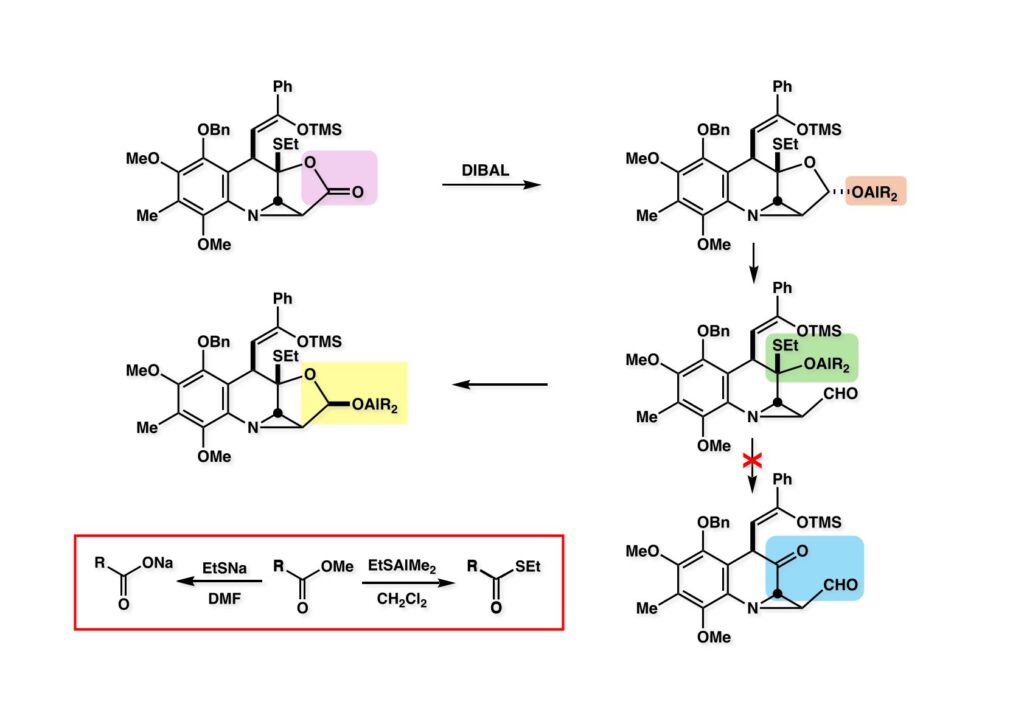 ラクトン (1-1) をDIBALで還元すると、お椀型の分子なので試薬は十中八九convex面から攻撃すると考えられるので (1-2) が生成するだろう。おそらく可逆的な反応でラクトールの開環が起きるとすると (2-2) が生成する。ここでもしR2AlSEtが脱離すればケトアルデヒド (3-4) に変換され、DIBALによってさらに還元されると考えられ、ゴチャゴチャいじれば何とかなっただろうが、苦労することは目に見えている。ところが実際は、(2-2) でアルコキシド (2-2) は直ちに閉環して (1-2) より安定なラクトール (2-2) を安定な化合物として与えた。この経路は結合エネルギーに関係しているだろう。即ち、bond dissociation energyの表をもとにして乱暴な議論をするとすれば、Al-S (89.4 kcal/mol)、Al-O (122.4 kcal/mol) で、(2-2) においてEtSAlR2を追い出す方がエネルギー的に不利であり、環化しなおしてAl-O結合を生成した方が有利となる理屈だ。ちなみにメチルエステル (3-2) もEtSAlR2と反応させるとチオエステル (3-3) に変換できるがNa塩ではそうはいかない。DMF中でEtSNaと加熱すると脱メチル化が起きるだけである。