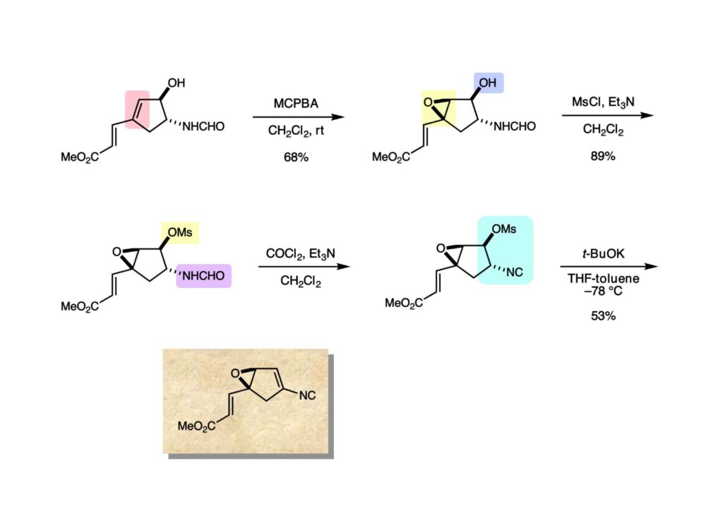 MCPBAによる (1-1) のエポキシ化はHenbest ruleに従ってアルコールと同じ側から生成物 (1-2) を与えた。ここでアルコールをメシル化して、得られた (2-1) をホスゲンとEt3Nで脱水するとイソニトリル (2-2) が得られた。イソニトリルは酸性条件では分解するが中性、塩基性では比較的安定な官能機であり、αプロトンは少し酸性になっている。例えばPhCH2NCを低温下でBuLiを作用させると脱プロトン化がきれいに進行する。ここでは当初t -BuOK/t -BuOHでメシレートを脱離させようとしたが目的物は得られなかった。そこで市販のt -BuOK粉末を低温下で用いたところ脱離反応が進行して望む化合物 (3-1) が得られた。この化合物は不安定でNMR測定後に溶媒を除去乾固したら15分ほどで褐色になり分解してしまった。No Name 化合物は小さくて合成容易のように見えるが、そんなに簡単な化合物ではない。おそらくその後も誰も全合成を達成していないのは、ただ単に人気が無い化合物ということだけでもなさそうかな?