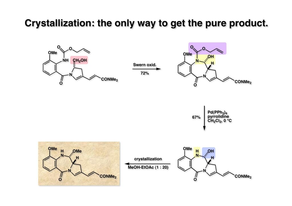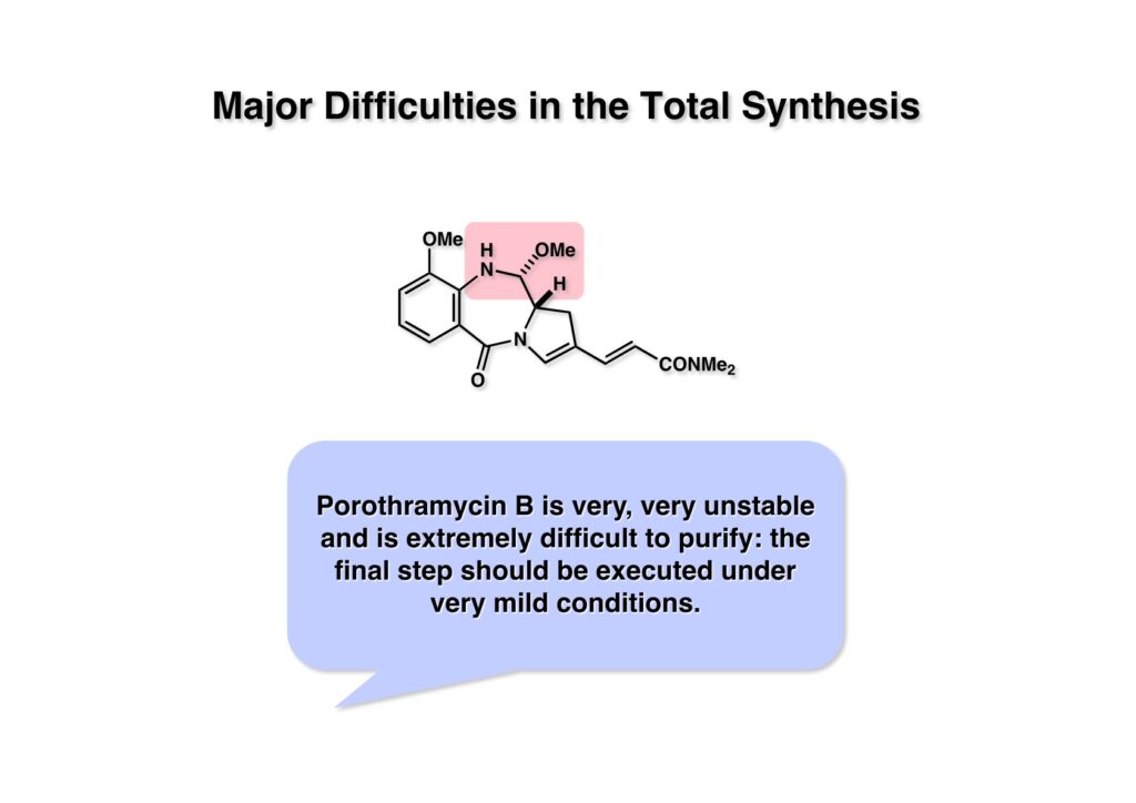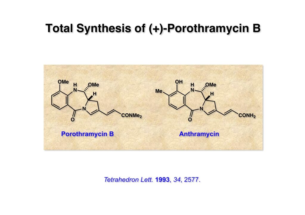 Porothramycinは以前東京にあったブリストル万有研究所で単理構造決定された微生物由来の抗生物質で、有名なanthramycinに非常によく似た構造を有する。Porothramycin Aはヘミアミナール部分がOH体でBはMeO体という違いであるが、両者とも不安定で我々がサンプル請求をした時点でフリーザーに保管されていた化合物は全部分解しているという返事をいただいた。AnthramycinはニュージャージーのHoffmann-La RocheでMilan Uskokovicが最初の全合成に成功したと報告されたが、本当にそうなのかイマイチ確信が持てない。2番目の全合成はコロラド州立大学のJohn Stilleが飛行機事故で亡くなった月(1989年7月)のJACSに発表されている。しかし、実験項を見ると最終ステップでメタノール中少量の塩酸で脱保護操作をしているが200 mgの出発物を使っているにもかかわらず、最終物を単離しておらず、粗生成物のNMRがUskokovicに送ってもらった天然物のピークと一致したという曖昧な記述がある。(論文最後のセンテンス;…and isolation of anthramycin (1b) was carried out by the original procedure to give crude product, whose 1H NMR spectrum was compared to an authentic sample.) とにかく、anthramycinもporothramycinも非常に不安定で最終物を純粋な化合物として単離するのはそれなりの工夫が必要である。