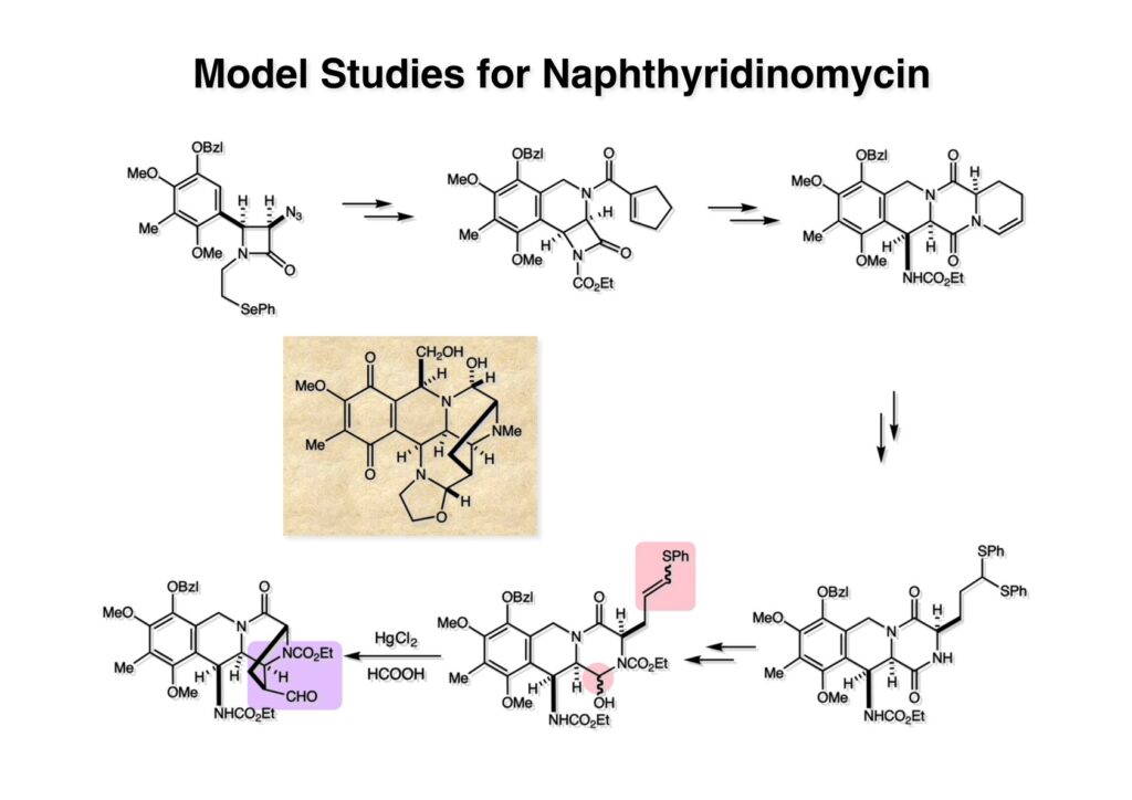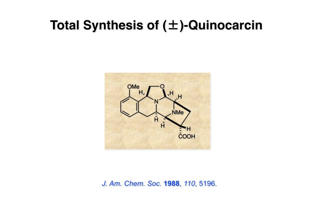 Quinocarcinの全合成はnaphthyridinomycinの全合成研究をやっていなければ着手しなかったプロジェクトである。後者のモデル実験をやっている時に、これはquinocarcinにも使えると思い合成を開始した。Joe Nunesというカーネギーメロン大学出身の学生で、物静かな真面目な若者で根性も十分備えていた。カーネギーメロン大化学科の助教授だった目さんに勧められて私の研究室に来た。目さんはWoodward研のポスドクをされている時に重なっていて、erythromycinの全合成チームに属していた。威勢の良い方だったが若くして亡くなられたのは残念である。