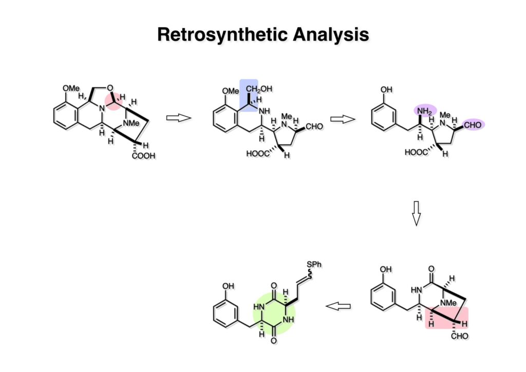 Quinocarcin (1-1) のオキサゾリジン環を加水分解し、得られるヘミアミナールを開環すると (1-2) に導かれる。(1-2) のテトラヒドロイソキノリン環は (1-3) からPictet-Spengler反応で構築する。(1-3) のアミンとアルデヒドを結合してジケトピペラジン (2-2) にし、前述のアシルイミニウムイオン経由のビシクロ体構築を念頭に入れれば (2-1) のような比較的単純なDKPに辿り着く。