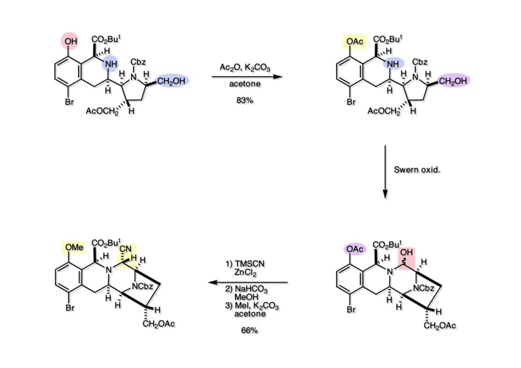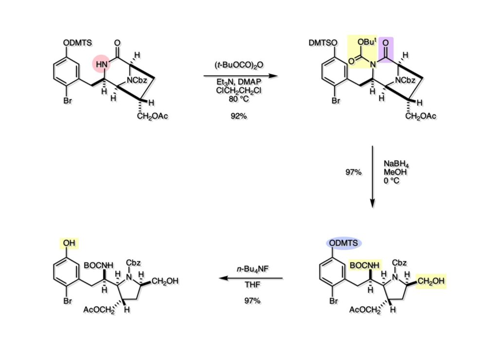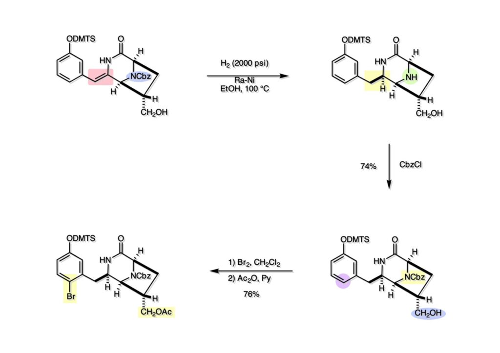 (1-1) のオレフィンの接触還元はsaframycin の全合成にも用いた方法でビシクロ[3.2.1]体のexo面から還元してendo体 (1-2) を得た。この際外れてしまったCbz基をかけ直して (2-2) に変換した。後にPictet-spengler反応を行うのだが、フェノールを同反応に用いるとpara位が空いているとortho位よりも優先して反応してしまうので、常套手段であるブロモ基で (2-2) のpara位をブロックし、アセチル化を行って (2-1) を得た。